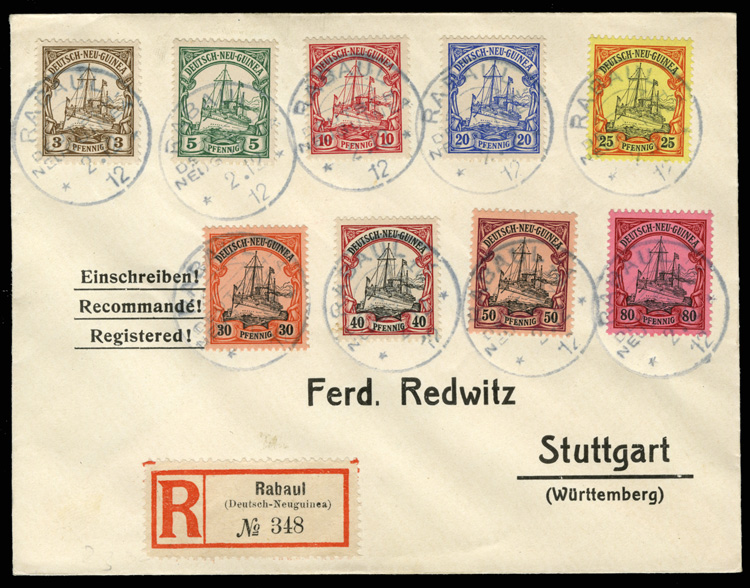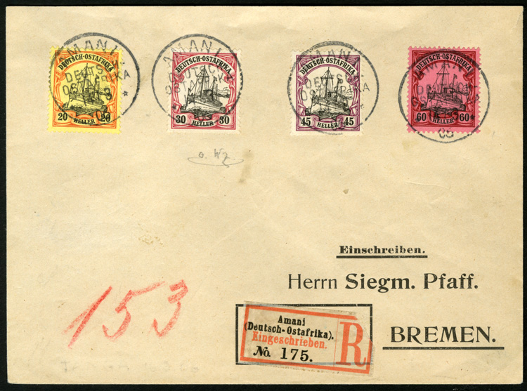 COLONIES German East Africa 1906 (14 Mar) registered cover from Amani to Bremen, franked with Yacht 20h, 30h, 45h and 60h (unwatermarked), tied by cds, with Tanga transit pmk on back, v.f. (Image)
