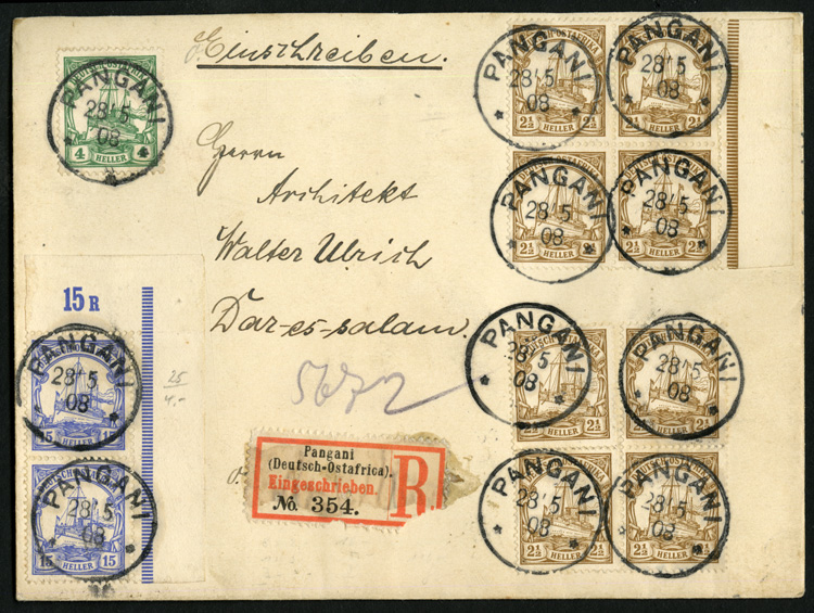 COLONIES German East Africa 1908 (28 May) registered cover from Pangani to Dar-es-Salaam, franked with 8x2 1/2h, single 4h and pair of 15h, paying 54h, with arrival (Dar-Es-Salaam Deutsch Ostafrika 30 5 08) on back, some toning around the registry