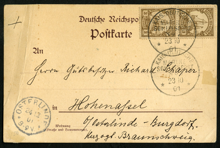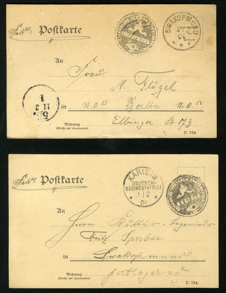 COLONIES German South-West Africa 1904 two fieldpost cards, one from Swakopmund to Berlin, the other from Karibib to Swakopmund, each with corresponding negative official handstamp and pmks, fine (Image)