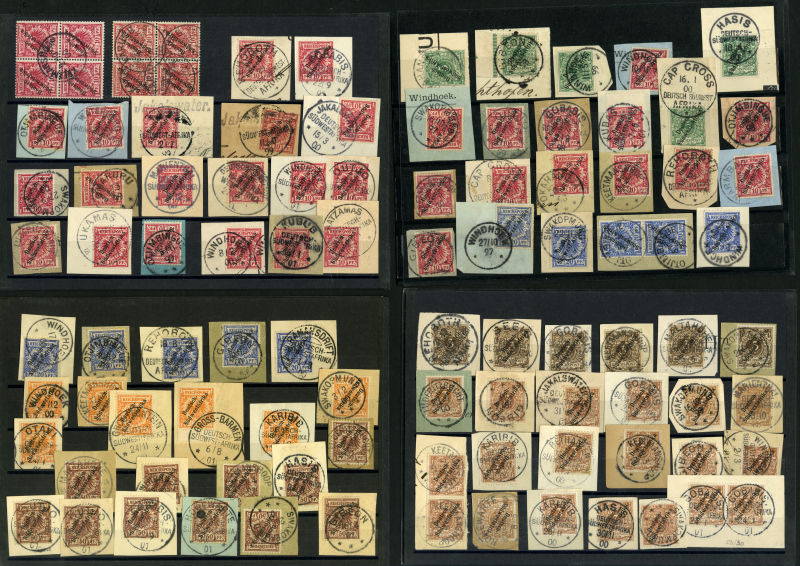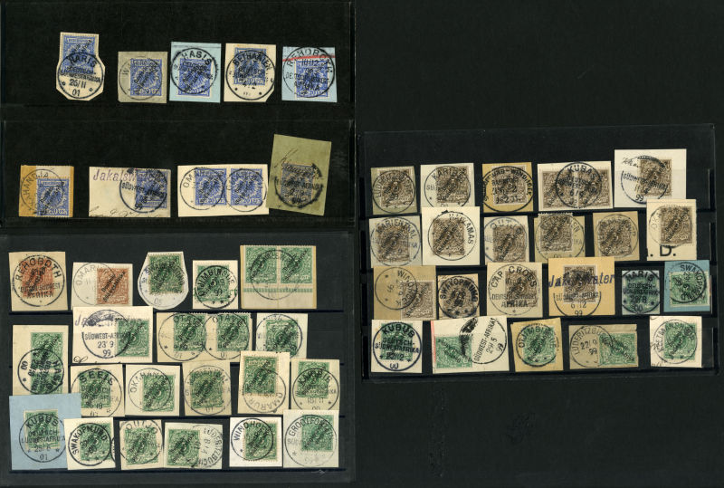 (6), 3pf yellow brown (19), 3pf red brown (2), 5pf green (21), 20pf ultramarine (5), 25pf orange (7), 50pf red brown (11), canceled by a variety of German Postal Agencies pmks including Camp-Gross, Okahandja, Seeis, Rehoboth, Omaruru, Swakopmund,