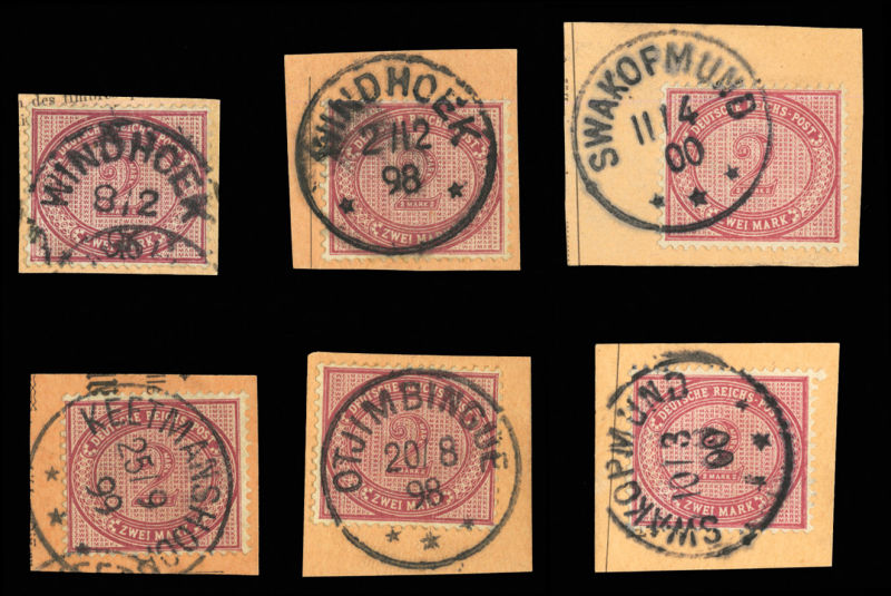 COLONIES German South-West Africa 1898 Forerunners, 2M lilac, six copies used on individual pieces, canceled Swakopmund, Otjimbingue, Windhoek and Keetmanshoop, various shades, fine-v.f., scarce group (Image)