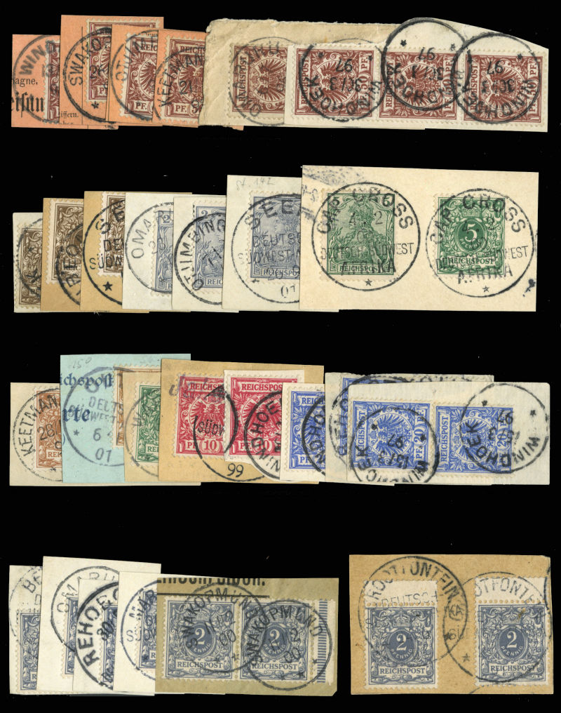 COLONIES German South-West Africa 1899-1901 Forerunners, selection of 36 Eagle and Reichspost stamps canceled on pieces by a variety of pmks including Camp-Gross, Seeis, Rehoboth, Omaruru, Swakopmund, Otjimbingue, Windhoek, Keetmanshoop, Bethanien,