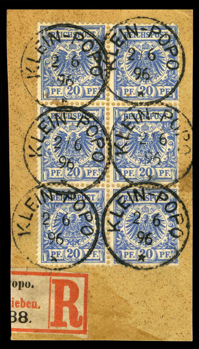 581 O, bl   imageGERMAN COLONIES Togo 1896 Germany 20pf Eagle, block of six tied on piece by Klein-Popo 2.6.96 cds, slight soiling, otherwise fine and impressive piece (Image)