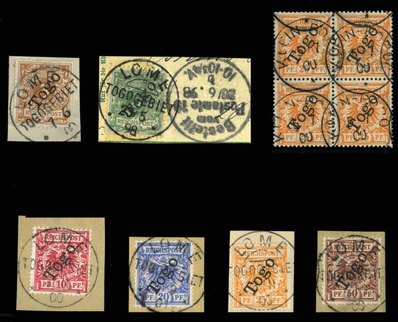 583 O   imageGERMAN COLONIES Togo (Mi.1-6) 1897 3pf-50pf overprints, set of six complete, each canceled by Lome pmk on piece, also 25pf orange block of four canceled Klein-Popo, fine-v.f. (Image)