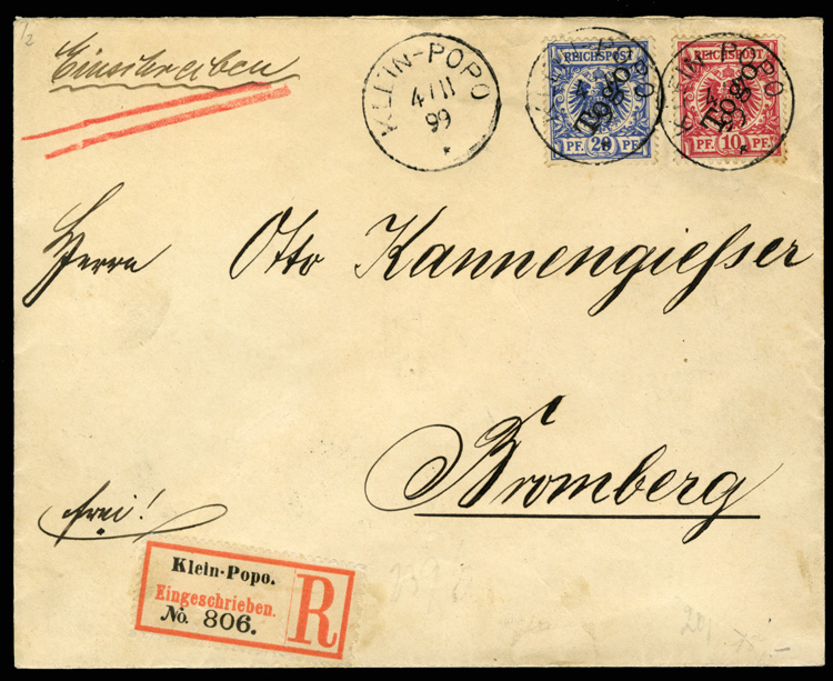 584 c   imageGERMAN COLONIES Togo (3,4) 1899 (9 Nov) registered cover from Klein-Popo to Germany, franked with 10pf and 20pf Togo overprints, tied by departure cds, with Bromberg arrival pmk on back (Image)
