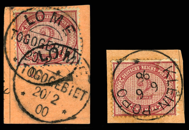 585 O   imageGERMAN COLONIES Togo 1900 Germany 2M lilac, two distinct shades, each canceled on piece by Klein-Popo or Lome/Togogebiet cancels, v.f. (Image)