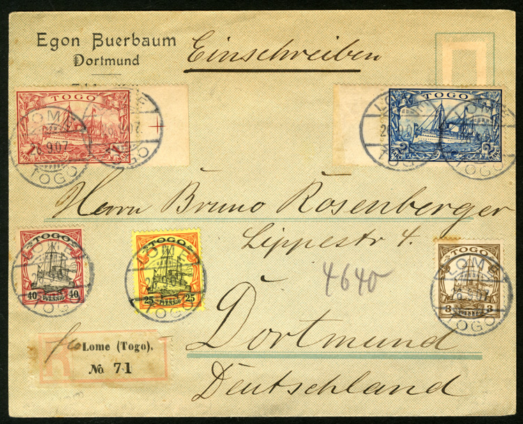 586 c   imageGERMAN COLONIES Togo (7/17) 1907 (16 Sep) registered cover from Lome to Germany, franked with five different Yacht stamps, including 1M and 2M, each canceled by departure cds, backstamped on arrival in Dortmund, some toning, otherwise fine-v.f. (Image)