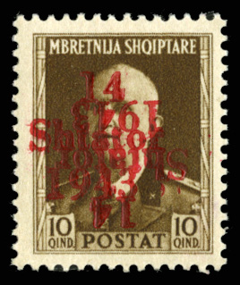 587 nh   imageGERMAN WORLD WAR II OCCUPATION ISSUES German Occupation of Albania (Mi.5DK) 1943 10 Qind, with clear double overprint, one inverted, n.h., v.f., signed Krischke, etc. (Image)
