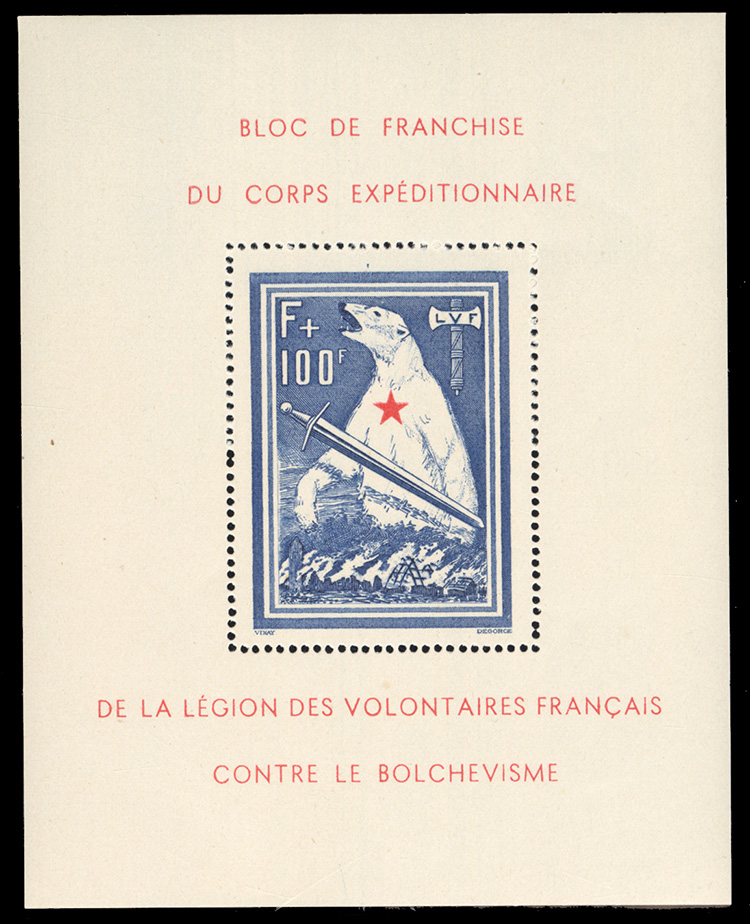 589 nh   imageGERMAN WORLD WAR II OCCUPATION ISSUES France - Legion Post (Mi.Block I) 1941 Legion des Volontaires Francais Contre Le Bolschevisme souvenir sheet, n.h., v.f. (cat. Euro 800) (Image)
