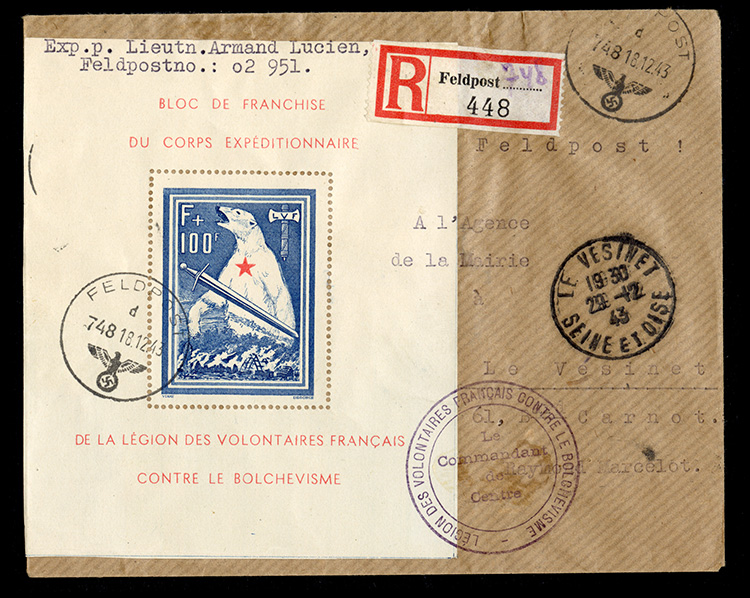 590 c   imageGERMAN WORLD WAR II OCCUPATION ISSUES France - Legion Post (Mi.Block I) 1941 Legion des Volontaires Francais Contre Le Bolschevisme souvenir sheet, used in 1943 on registered cover to Le Vesinet, France, sent by Lt. Arman Lucien Fieldpost Station No. 02 951 (typewritten in the top margin of the souvenir sheet, with corresponding Registry label affixed as well), with "Le Commandant de Centre" cachet, Fieldpost departure and 29.12.43 Le Vesinet arrival pmks, all on front, fine and remarkable, genuine usage of the Legion Post souvenir sheet on cover, minor wear, with 1991 Krischke certificate ("the sender was a member of the regimental staff of the French Grenadier Regiment 6 (FP No.02 951), which was stationed in the Generalgouvernement at that time. Normally Fieldpost letters with vignettes affixed to the address side were not permitted. Why this letter was delivered in any case, cannot be determined") (Image)
