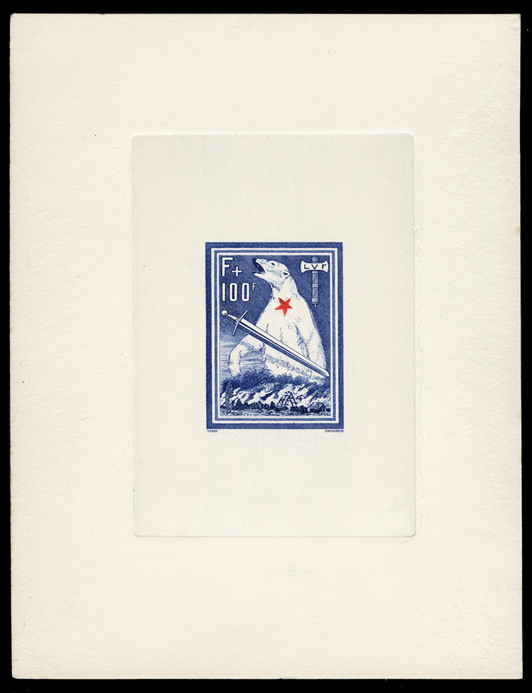 591 P   imageGERMAN WORLD WAR II OCCUPATION ISSUES France - Legion Post (Mi.Block IP) 1941 Legion des Volontaires Francais Contre Le Bolschevisme souvenir sheet, large die proof, die sunk on card, red star inverted, v.f., signed Tust, BPP, extremely rare, less than five (!) recorded (Image)