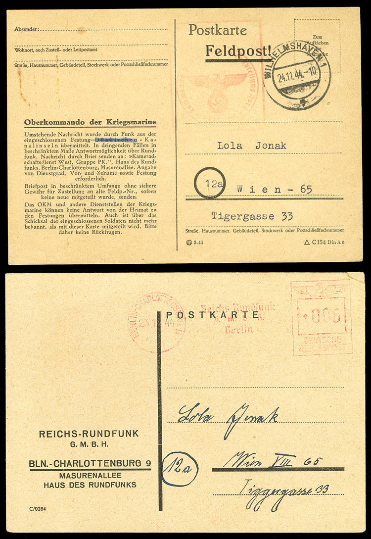 592 c   imageGERMAN WORLD WAR II OCCUPATION ISSUES German Occupation of the Channel Islands 1944 (22 Nov) "Feldpost" Radio Message card addressed to Vienna, datelined "Kanalinseln", Wilhelmshaven (24.11.44) dispatch cds, red censor mark, also a card from the same correspondence, dated 21.11.44, indicating acknowledgement of wireless message received, fine and extremely rare pair of cards from German Occupied Jersey (Image)