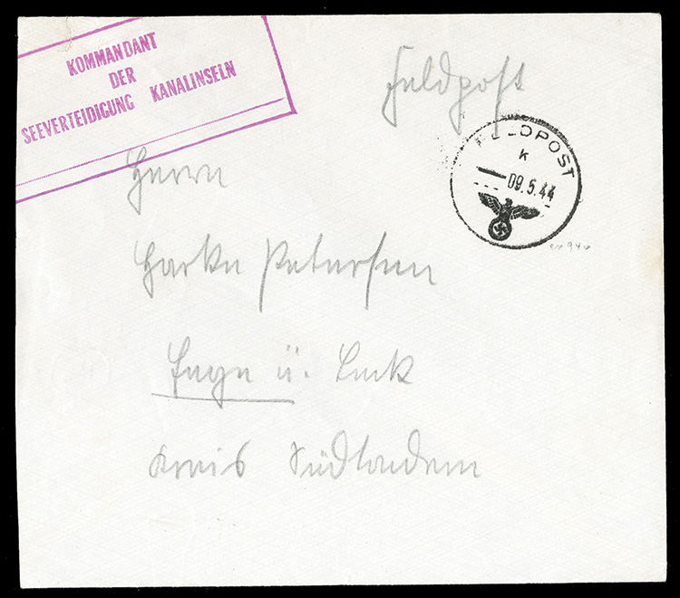 593 c   imageGERMAN WORLD WAR II OCCUPATION ISSUES German Occupation of the Channel Islands 1944 (9 May) cover (slightly reduced at left), endorsed "Feldpost" with corresponding departure pmk, violet "Kommandant der Seeverteidigung Kanalinseln" (Commander of Naval Defense Channel Islands) handstamp, fine (Image)