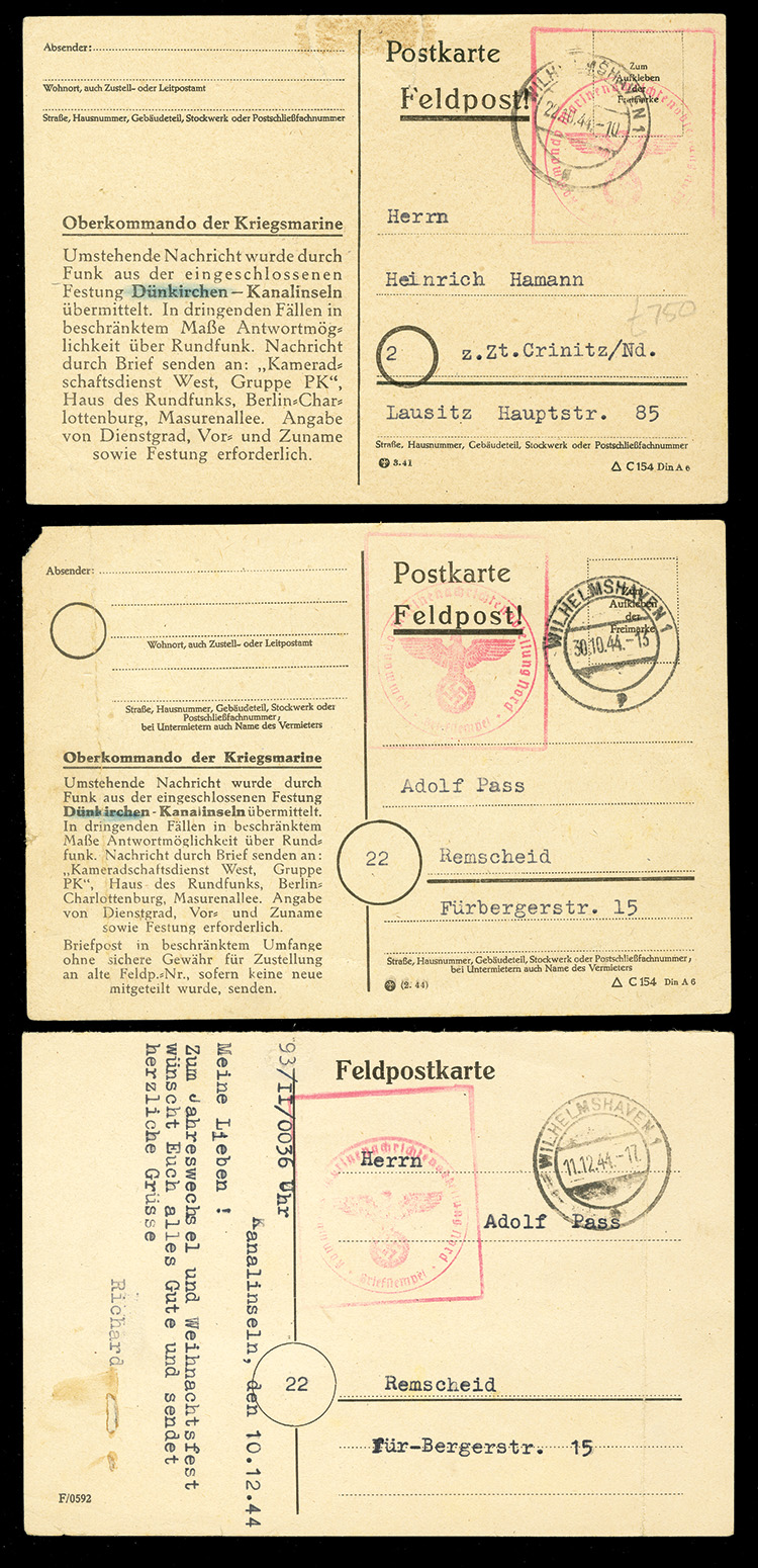 594 c   imageGERMAN WORLD WAR II OCCUPATION ISSUES German Occupation of the Channel Islands 1944 (Oct) three "Feldpost" Radio Message cards to Germany, datelined "Kanalinseln", each with Wilhelmshaven departure pmk, red censor marks, mixed condition, very rare group of cards from German Occupied Jersey (Image)
