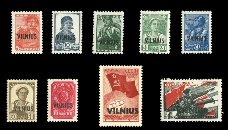 595 og, nh   imageGERMAN WORLD WAR II OCCUPATION ISSUES German Occupation of Lithuania (Mi.10-18) 1941 Vilnius, 5k-1r, complete set, 80k and few low values n.h., balance h.r., fine-v.f. (Euro 2,400) (Image)