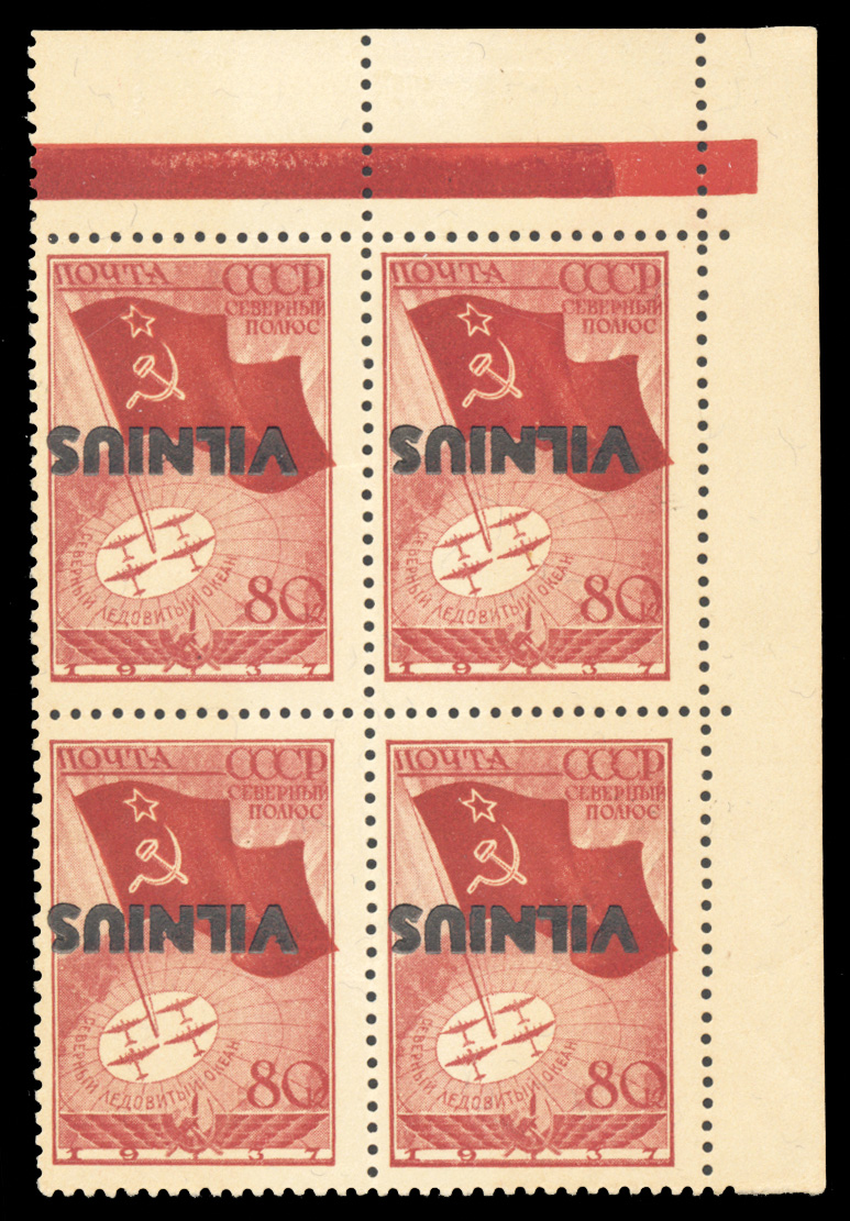596 og, nh, bl   imageGERMAN WORLD WAR II OCCUPATION ISSUES German Occupation of Lithuania 1941 Vilnius 80k carmine, overprint inverted, upper right corner sheet margin block of four, l.h. or h.r., v.f., with 2013 Krischke certificate. A rarity (only 100 inverted overprints printed) (Mi.17K, Euro 5,600+) (Image)