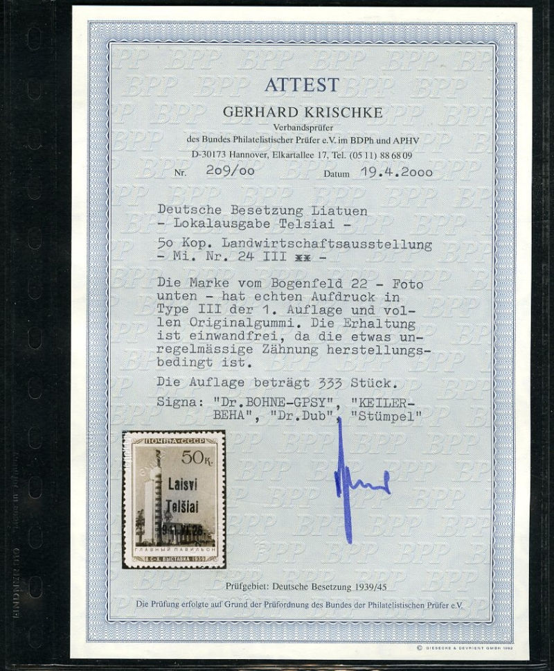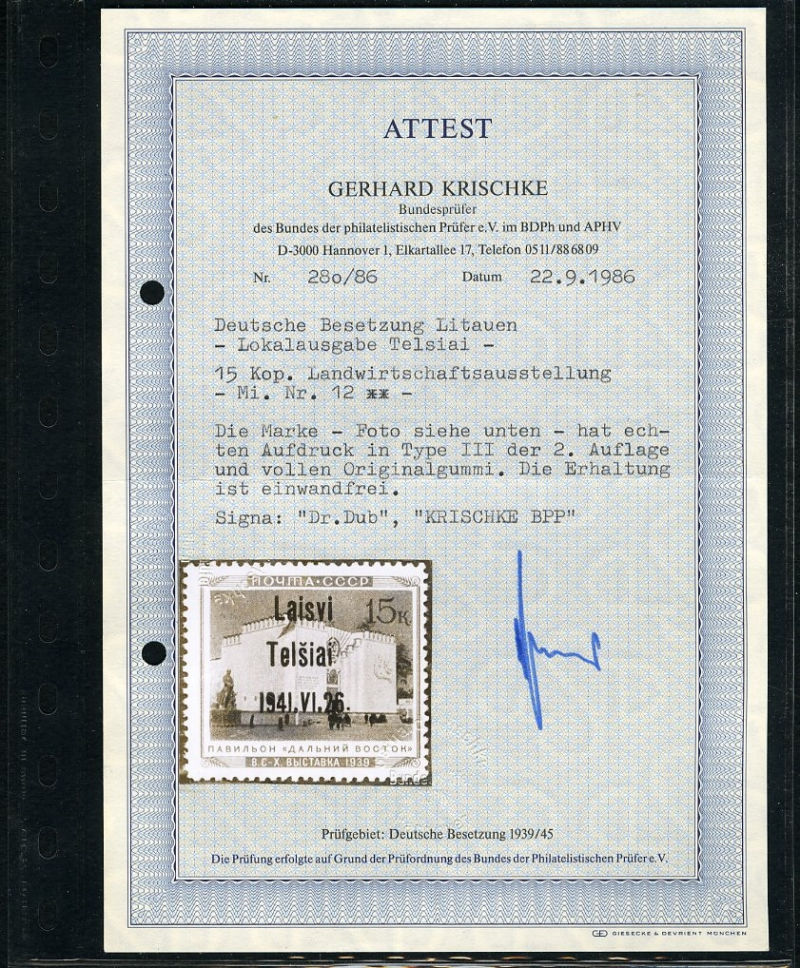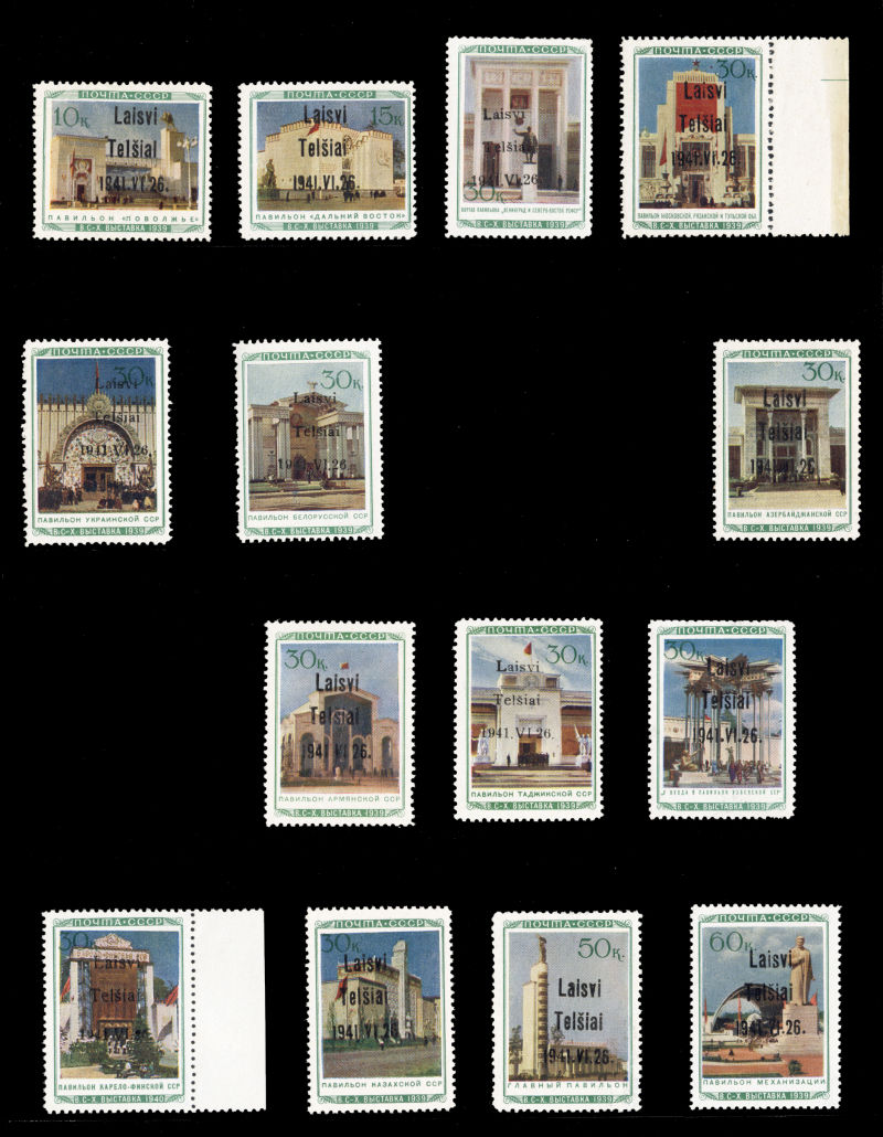 597 nh   imageGERMAN WORLD WAR II OCCUPATION ISSUES Lithuania - Telsiai (Mi.11-16,18-25) 1941 Pavilions, 10k-50k complete (missing only No.17), fourteen different, n.h., fine-v.f., signed Krischke, "J.G." (J.Grigalunas), Helmuth Steumpel, Keiler, GPSY, etc., with 9 Krischke certificates (cat. Euro 6,200) (Image) (Image 2) (Image 3) (Image 4) (Image 5) (Image 6) (Image 7) (Image 8) (Image 9) (Image 10) (All Images)