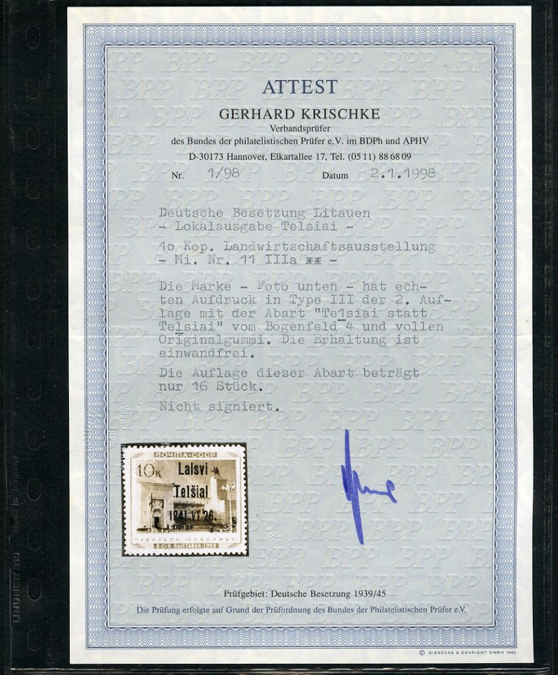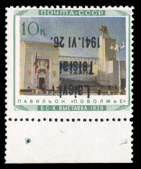 598 nh   imageGERMAN WORLD WAR II OCCUPATION ISSUES Lithuania - Telsiai (Mi.11 IIK) 1941 Pavilions, 10k overprint inverted, bottom sheet margin single, n.h., slightly dried gum, fine, signed "J.G.", with 2000 Krischke certificate, only 40 printed (cat. Euro 1,500) (Image)
