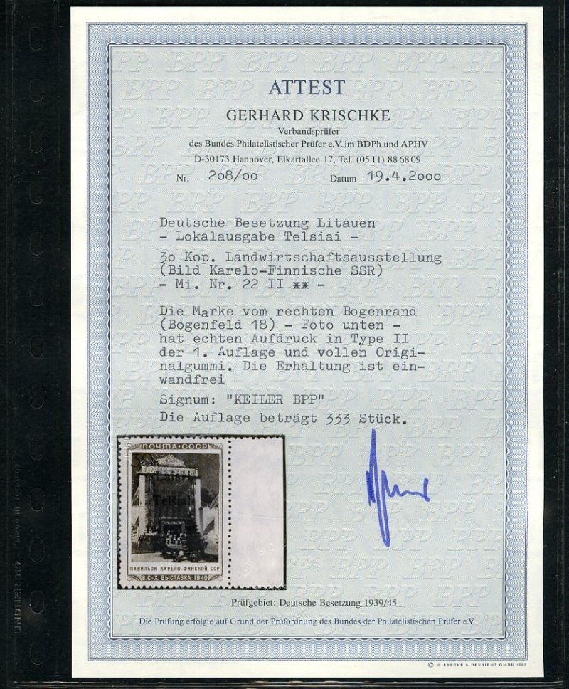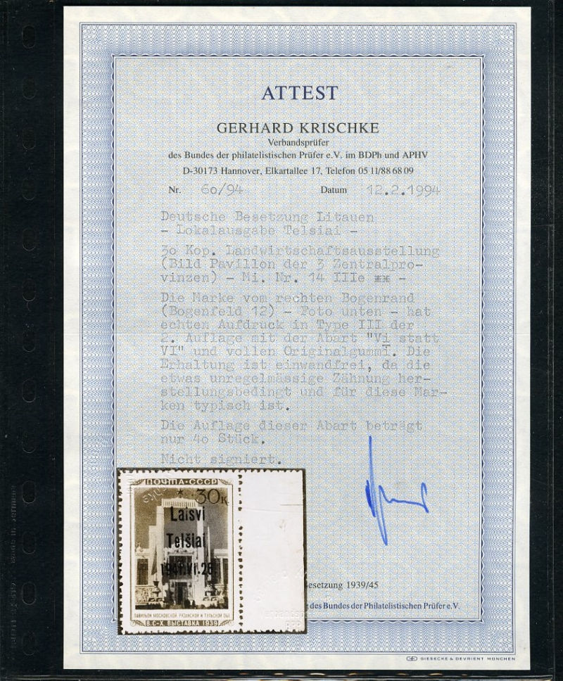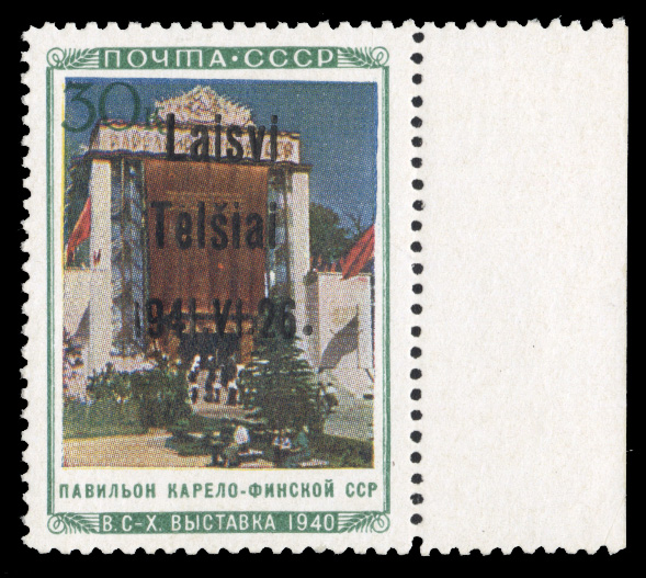 600 nh   imageGERMAN WORLD WAR II OCCUPATION ISSUES Lithuania - Telsiai (Mi.22 III) 1941 Karelia Pavilion, 30k overprint Type III, right sheet margin single, n.h., v.f., with 1994 Krischke certificate (cat. Euro 450) (Image)
