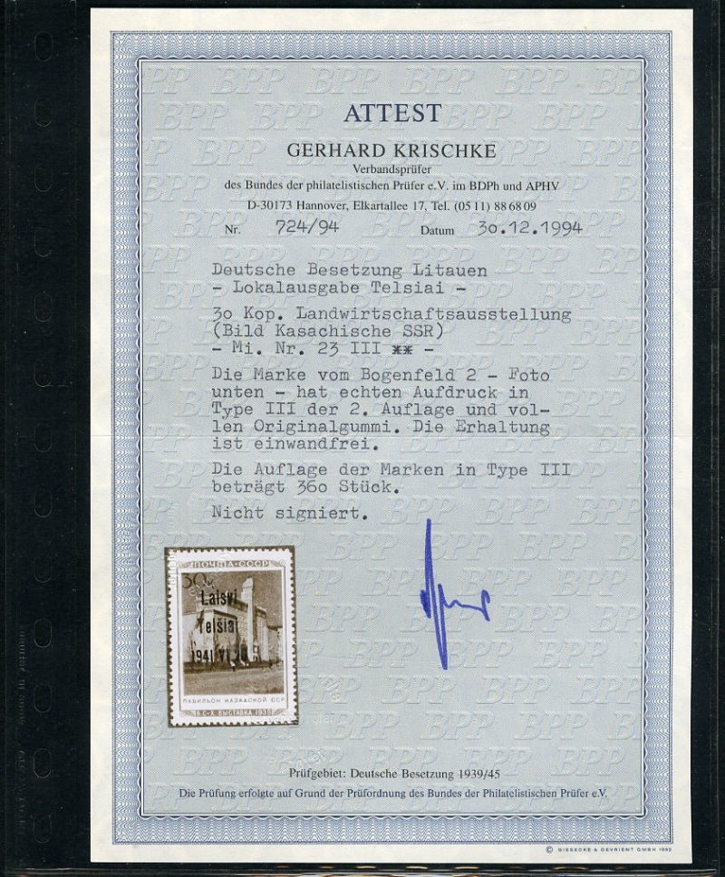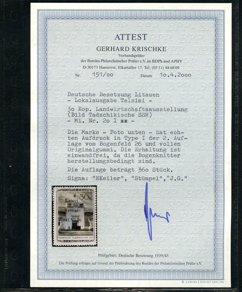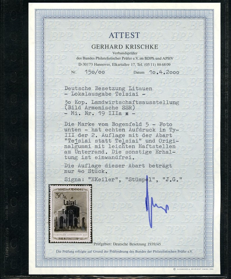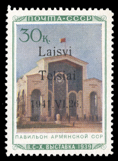 599 nh   imageGERMAN WORLD WAR II OCCUPATION ISSUES Lithuania - Telsiai (Mi.19 II) 1941 Armenia Pavilion, 30k overprint Type II, n.h., v.f., signed "J.G.", with 2000 Krischke certificate (cat. Euro 700) (Image)