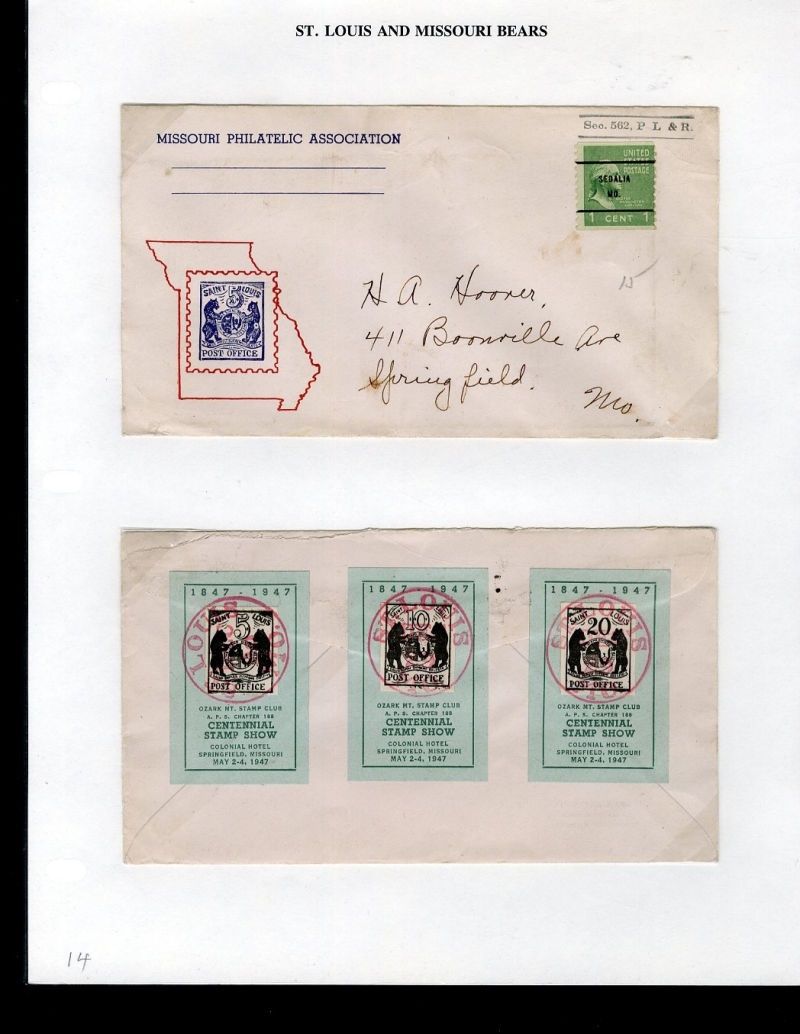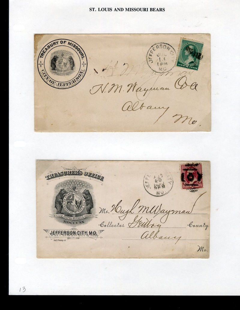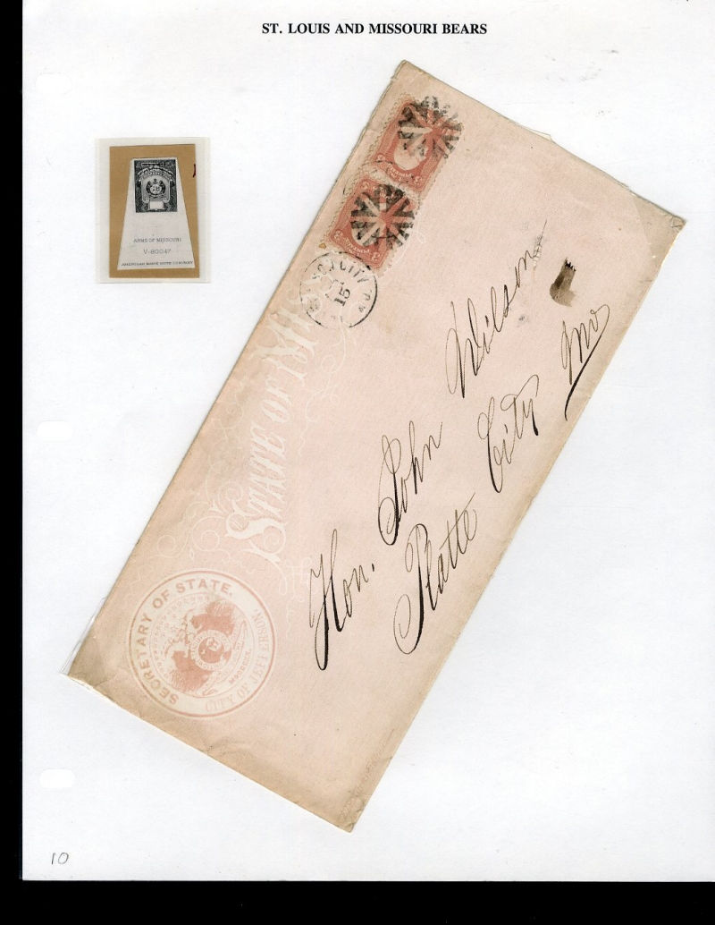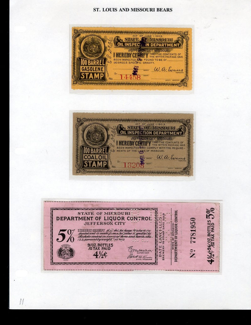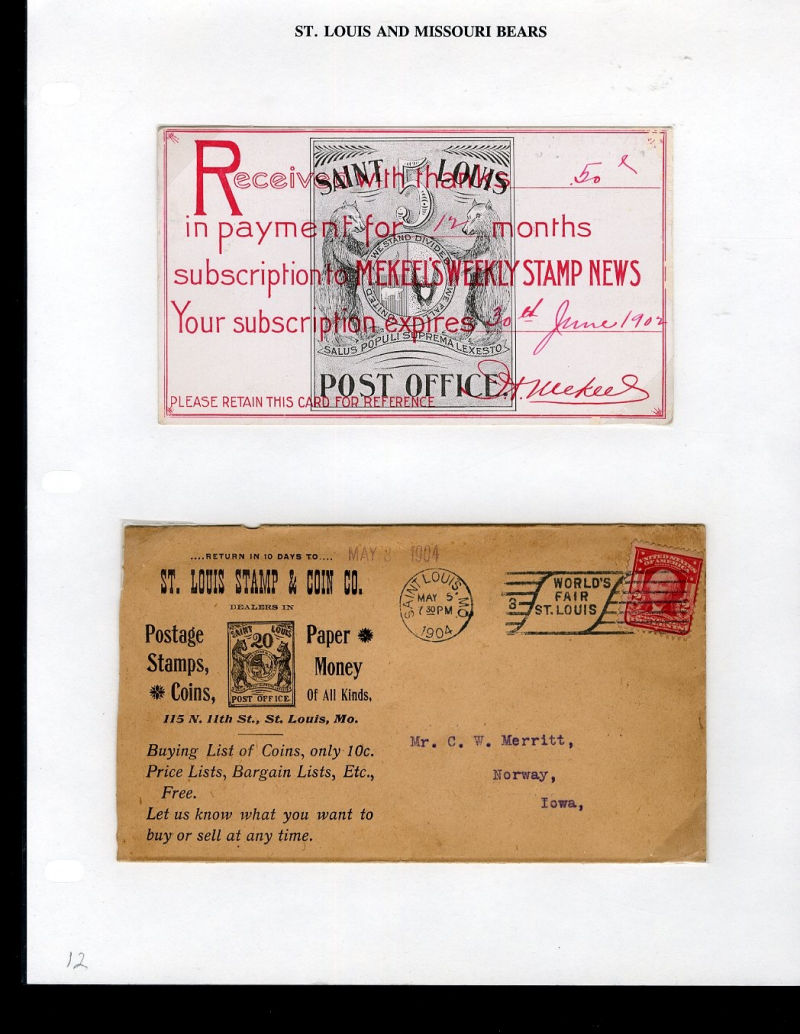 1065 c   imageLARGE LOTS AND COLLECTIONS UNITED STATES - Covers and Postal History 1865-1981 St. Louis and State of Missouri Bears, selection on exhibit pages and loose, with St. Louis Match Factory 1c green, die proof in black, 5c imitation on cover, Oil Inspection coupons, Secretary of State City of Jefferson, 1904 St. Louis Stamp & Coin Co. covers, etc., ex-Richard Drews ("Bear Necessities" exhibit) (Image) (Image 2) (Image 3) (Image 4) (Image 5) (Image 6) (Image 7) (Image 8) (Image 9) (Image 10) (Image 11) (All Images)