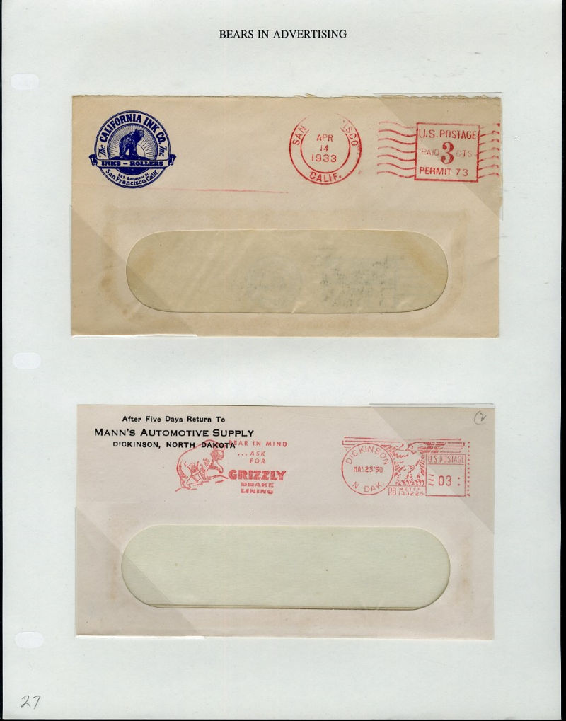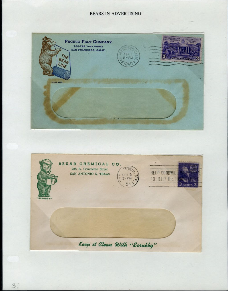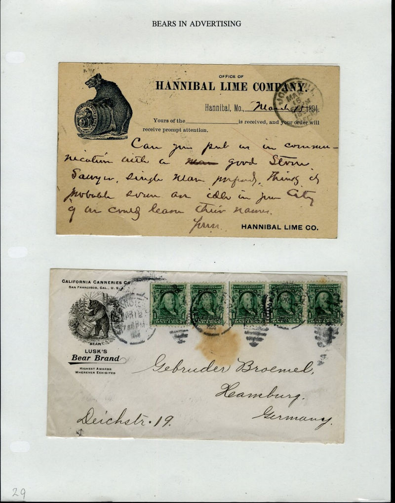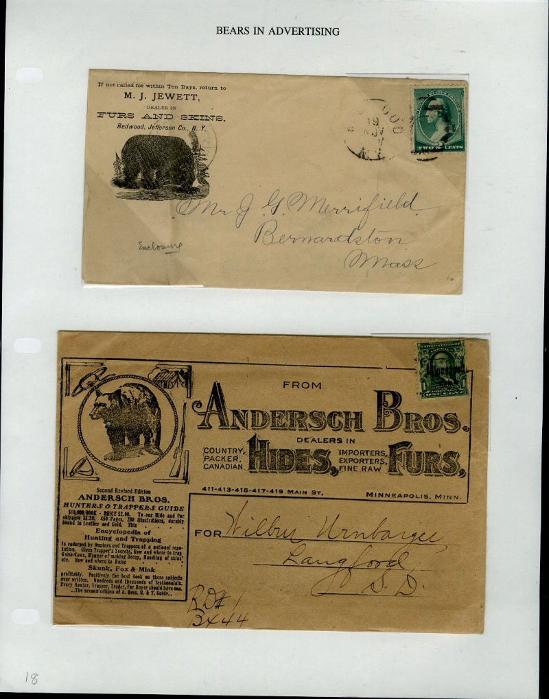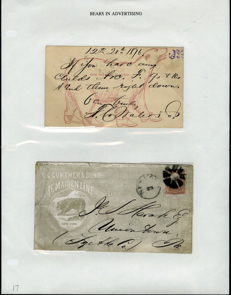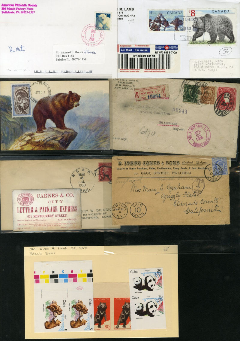 1066 c   imageLARGE LOTS AND COLLECTIONS UNITED STATES - Covers and Postal History 1865-1991 "Bears on Stamps", balance of Richard Drews'' exhibit, with Bears in advertising covers, Meter Mail, also Bear names (Bear Valley, Bear River, Bear (Ark), Grizzly Flats, Bear River, U.S.S. Bear, Bear Springs, plus many others), mixed condition, interesting and difficult to assemble (Image) (Image 2) (Image 3) (Image 4) (Image 5) (Image 6) (Image 7) (Image 8) (Image 9) (Image 10) (Image 11) (Image 12) (Image 13) (Image 14) (Image 15) (Image 16) (Image 17) (Image 18) (Image 19) (Image 20) (Image 21) (Image 22) (Image 23) (Image 24) (Image 25) (Image 26) (Image 27) (Image 28) (Image 29) (Image 30) (Image 31) (Image 32) (All Images)