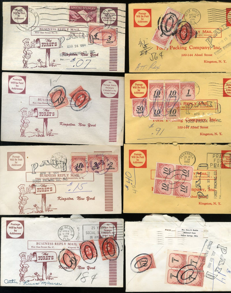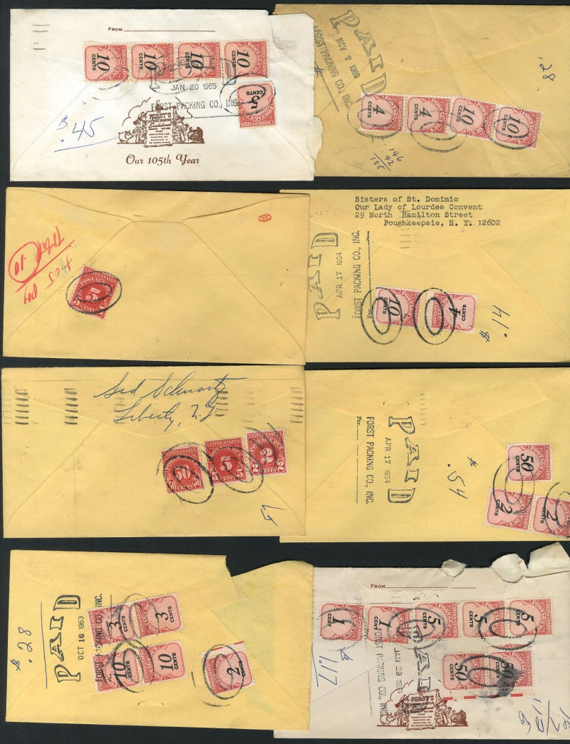 1069 c   imageLARGE LOTS AND COLLECTIONS UNITED STATES - Covers and Postal History Postage Dues 1960s accumulation of 300+ mostly business reply envelopes (to First Packing Company in Kingston, NY), each with postage dues added on arrival, different combinations include 1c, 2c, 3c, 10c, 50c, many multiple frankings, mixed issues, etc. An interesting group of modern postage dues on cover (Image) (Image 2) (Image 3) (All Images)
