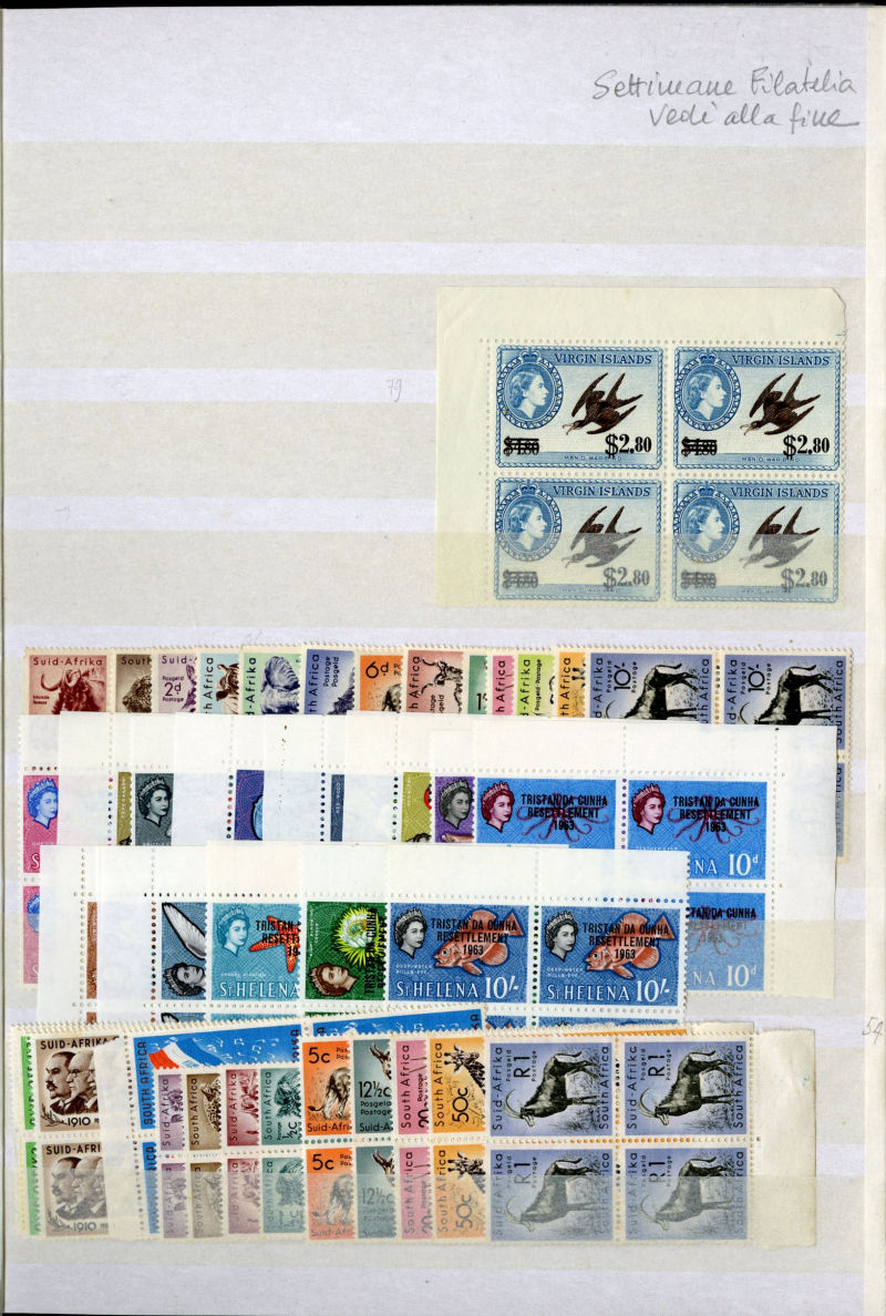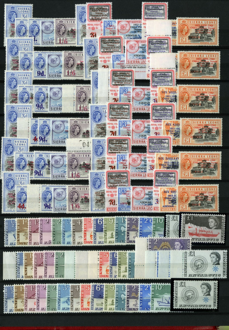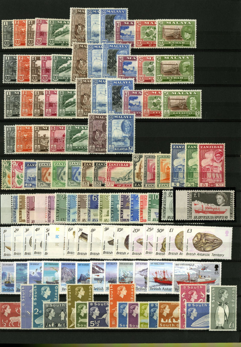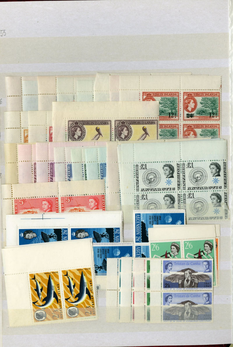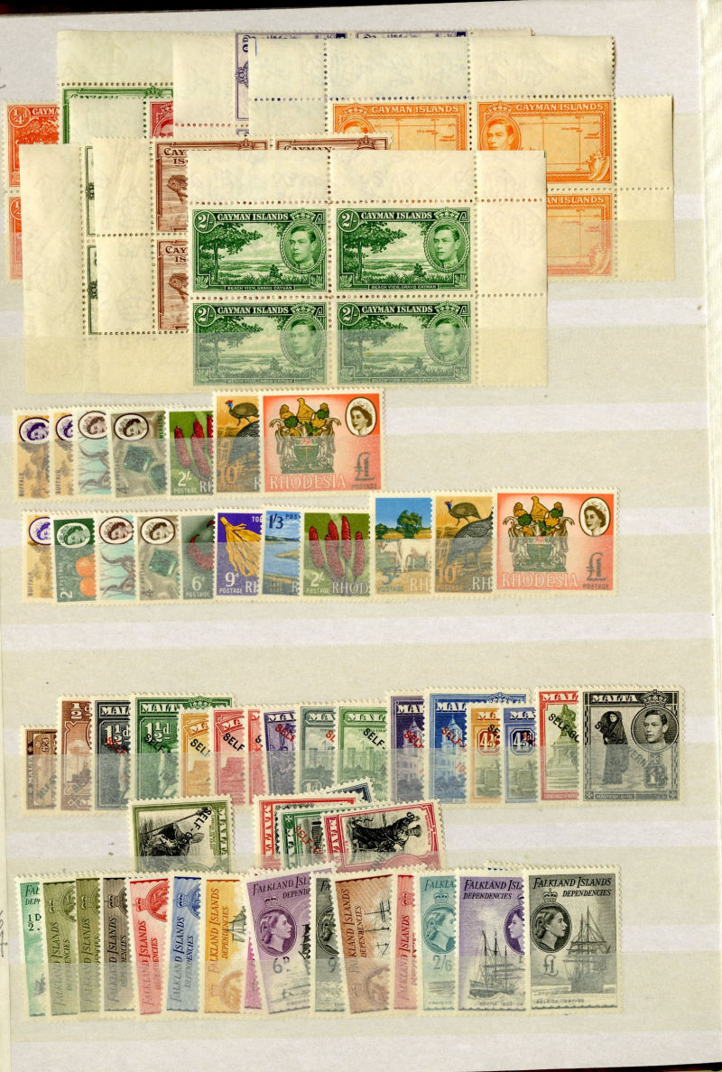 1076 nh   imageLARGE LOTS AND COLLECTIONS BRITISH COMMONWEALTH 1950s-60s accumulation in stock book, mostly QEII, with a nice selection of complete sets in blocks of four, including British Antarctic Territory (without £1 red and black), Cayman Islands, South Africa, St. Helena, Tristan Da Cunha, Virgin Islands, etc., also complete sets from Cyprus with souvenir sheets including Boy Scouts, Falkland Islands and Dependencies (including 1960 QEII), Malta, Papua New Guinea, Rhodesia, South Georgia (three sets, without £1 gray black), etc., also selection of Great Britain, with George VI sets to £1 (incl. 10sh indigo, with slight toning), QEII, etc., apparently n.h., fine-v.f. and useful lot, SG £5,000+ (Image) (Image 2) (Image 3) (Image 4) (Image 5) (Image 6) (Image 7) (Image 8) (Image 9) (Image 10) (Image 11) (Image 12) (Image 13) (Image 14) (Image 15) (All Images)