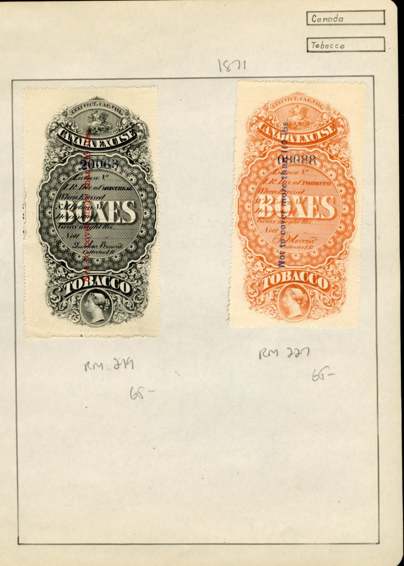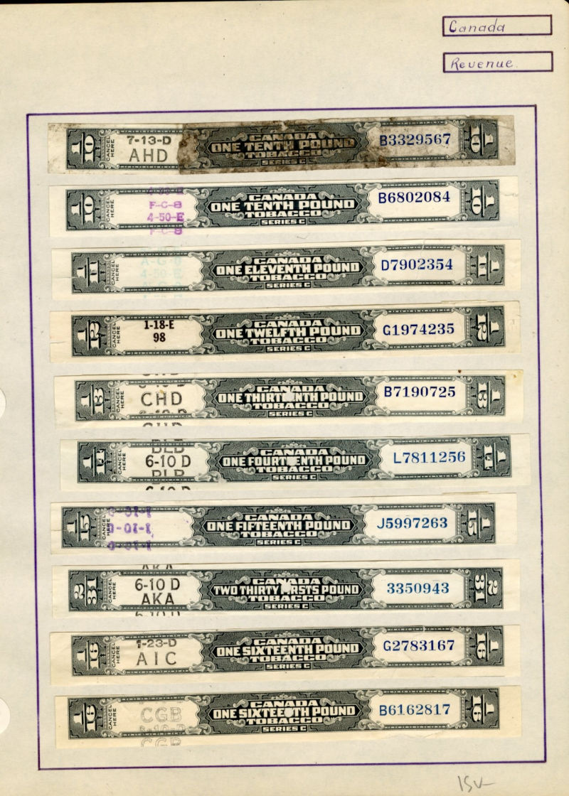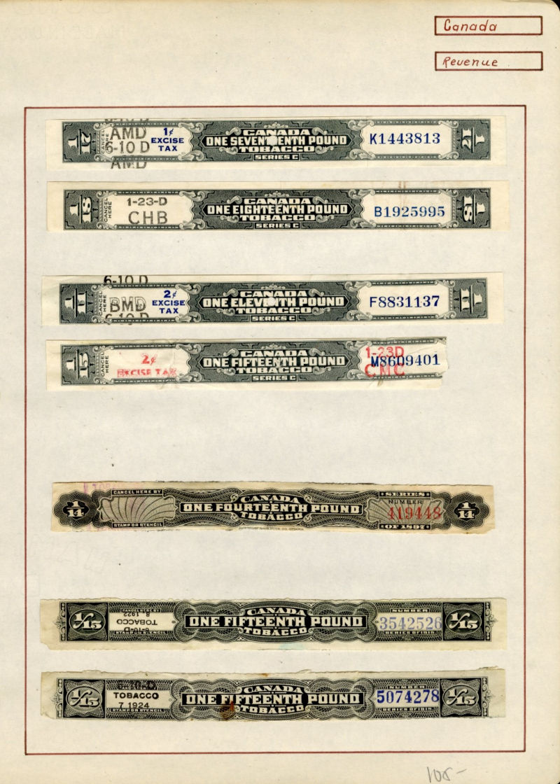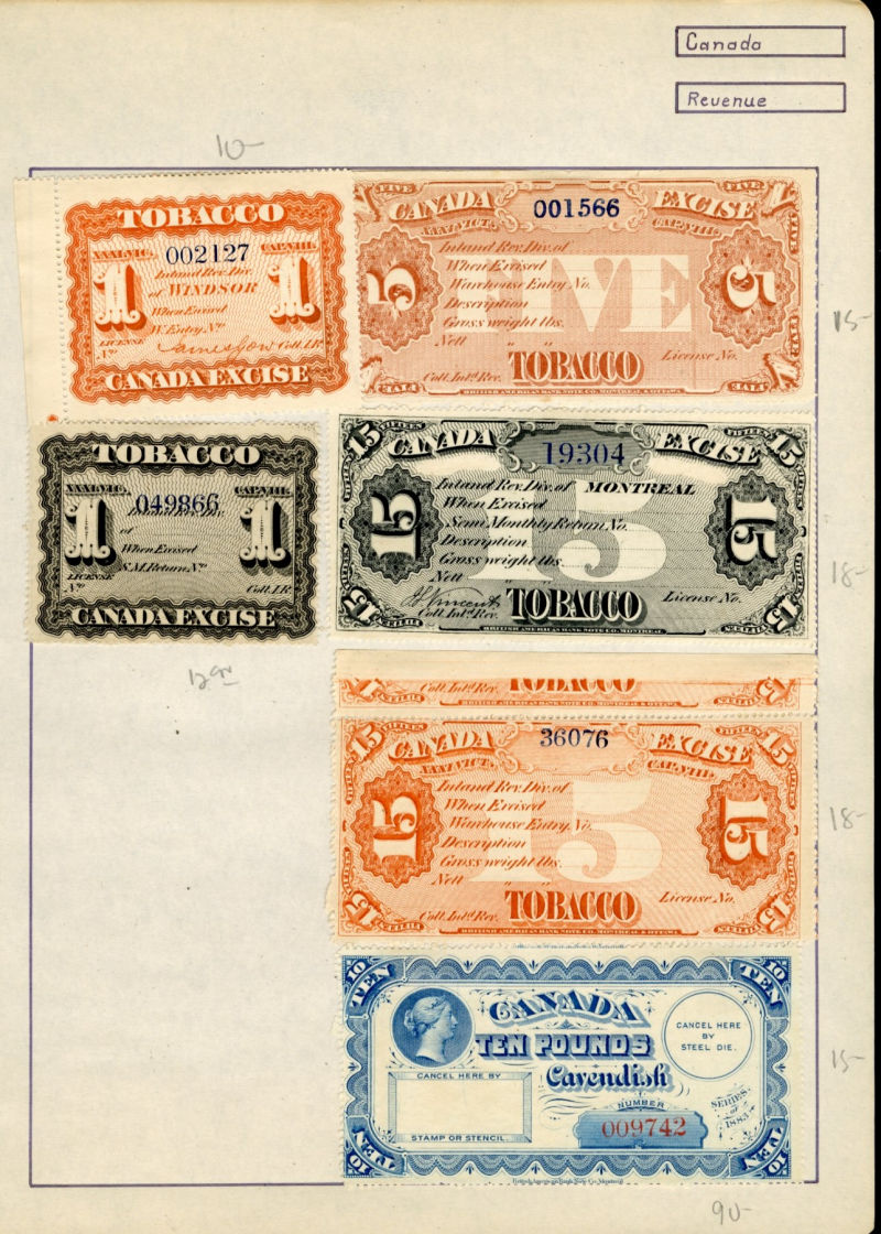 1080 O, og   imageLARGE LOTS AND COLLECTIONS CANADA Revenue Stamps 1900s-40s selection of 250+ used and unused on pages, early large Tobacco stamps, Bill stamps, Electric & Gas Inspection, etc., mixed condition (Image) (Image 2) (Image 3) (Image 4) (Image 5) (All Images)