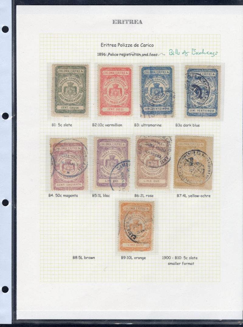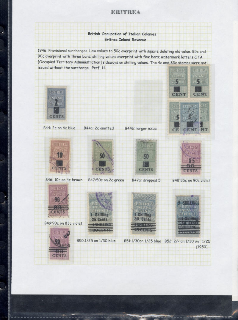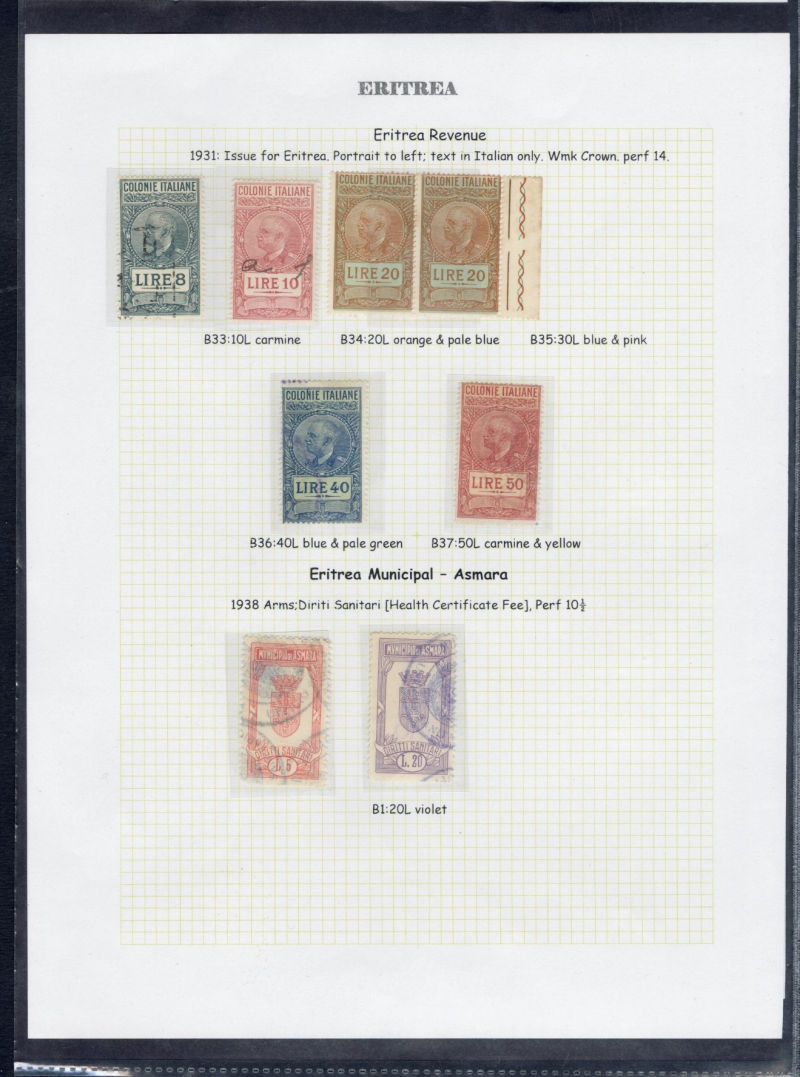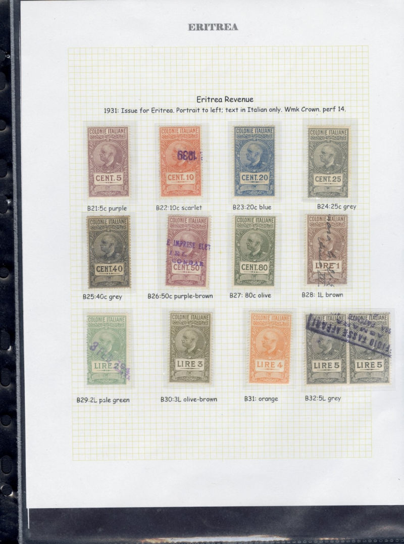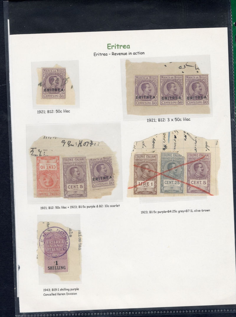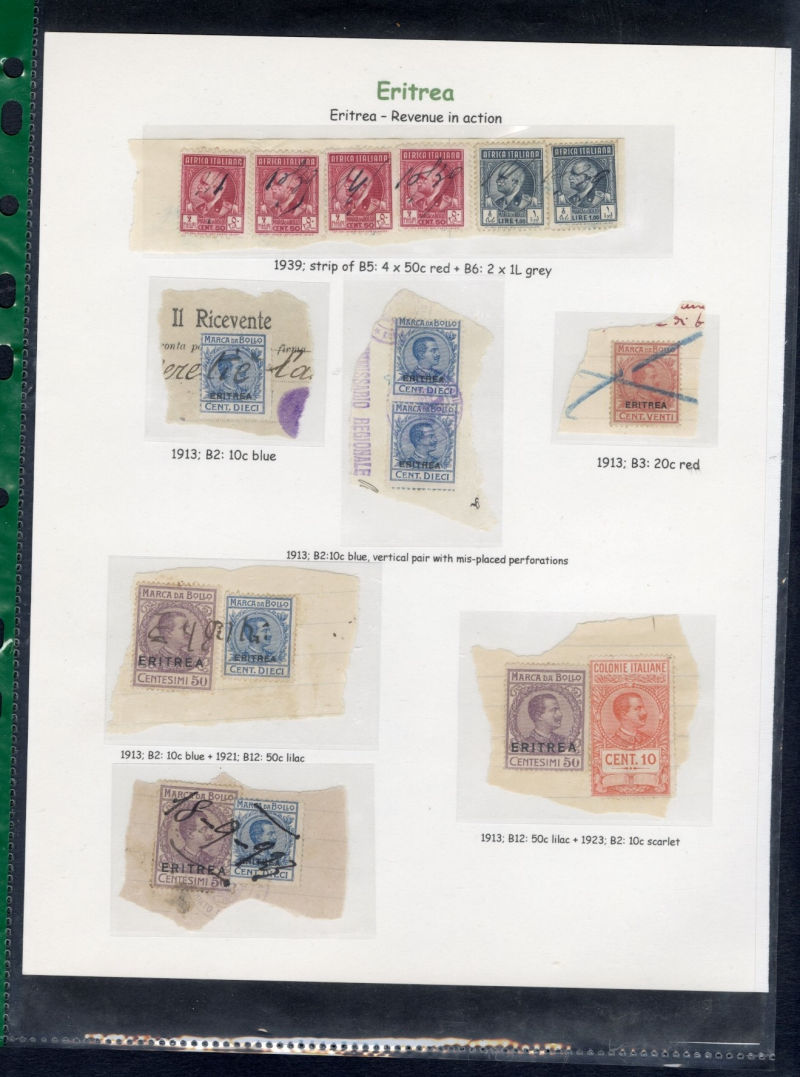 1147 O, og   imageLARGE LOTS AND COLLECTIONS ITALIAN COLONIES Revenue Stamps 1896-1961 Eritrea, collection on pages, used and unused values to 50 Lire, occasional multiples, documents, "Tassa Camerale Polizze de Carico" (Chamber of Commerce Tax Bills of Lading), Eritrea Municipal Tax, Automobile Tax, overprinted "A.O.I.", British Occupation "Eritrean Inland Revenue", values in East African Shillings, later issues with portrait of Haile Selassie, etc., scarce lot (2013 Barefoot catalogue £4,500+, not counting documents or multiples) (Image) (Image 2) (Image 3) (Image 4) (Image 5) (Image 6) (Image 7) (Image 8) (Image 9) (Image 10) (Image 11) (Image 12) (Image 13) (Image 14) (Image 15) (Image 16) (Image 17) (Image 18) (Image 19) (Image 20) (Image 21) (Image 22) (Image 23) (Image 24) (Image 25) (Image 26) (Image 27) (Image 28) (Image 29) (Image 30) (Image 31) (Image 32) (Image 33) (Image 34) (All Images)