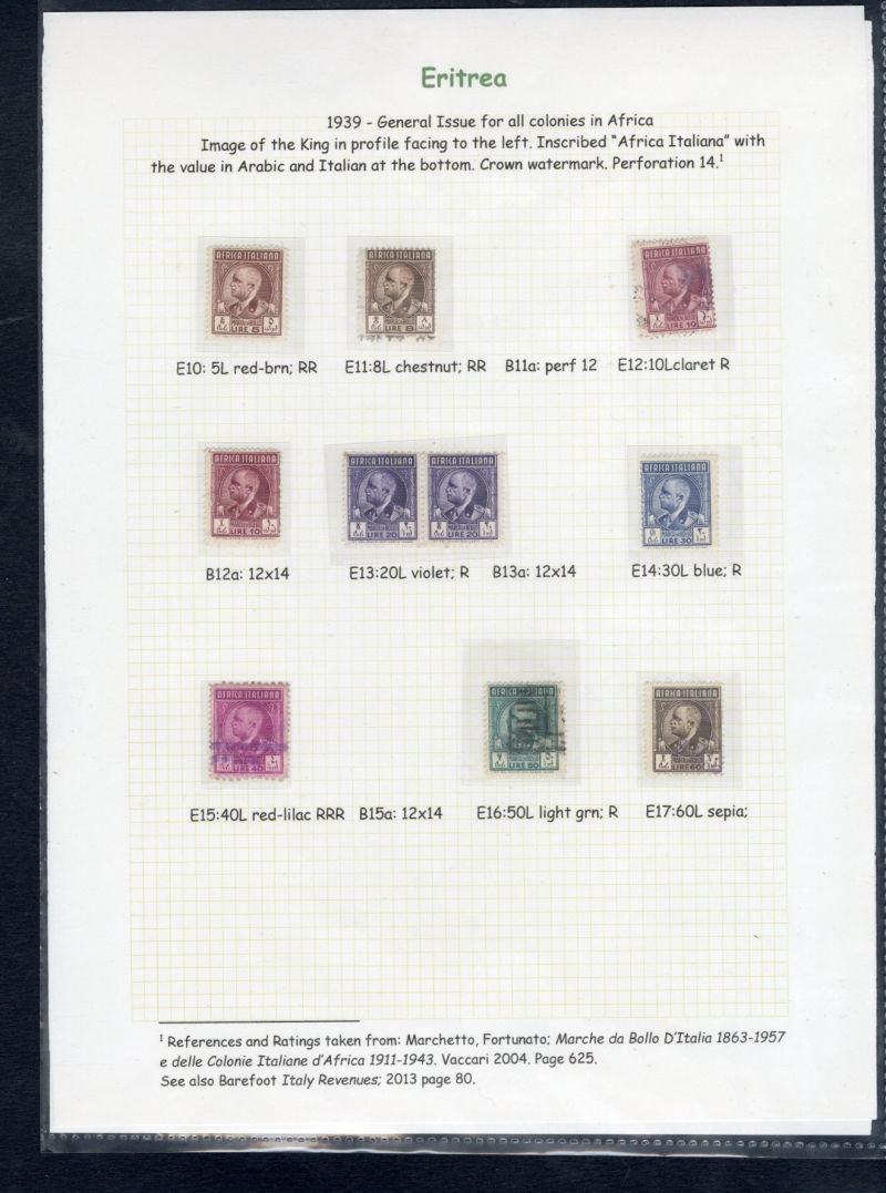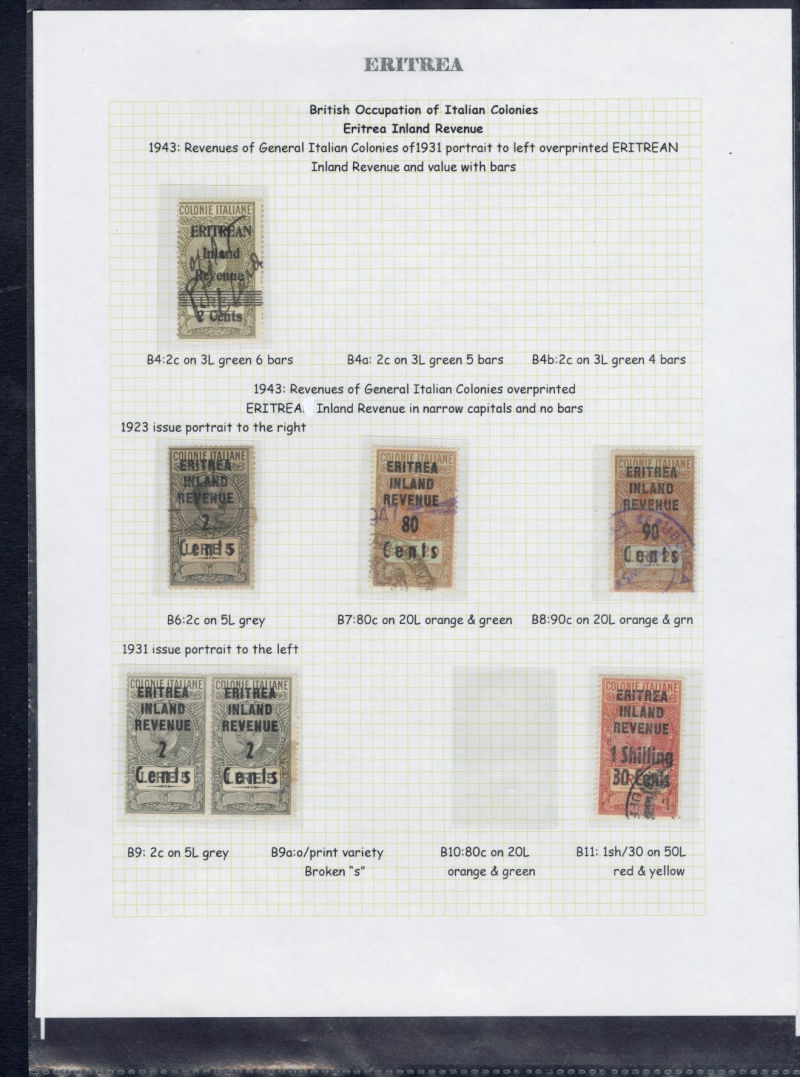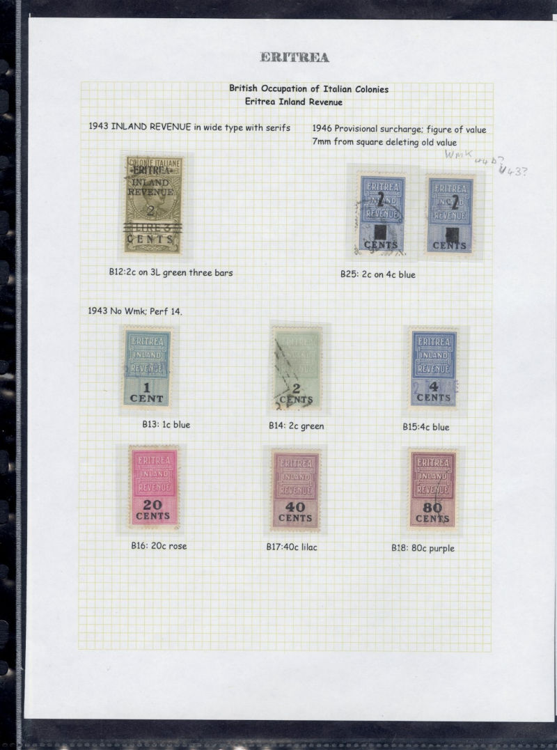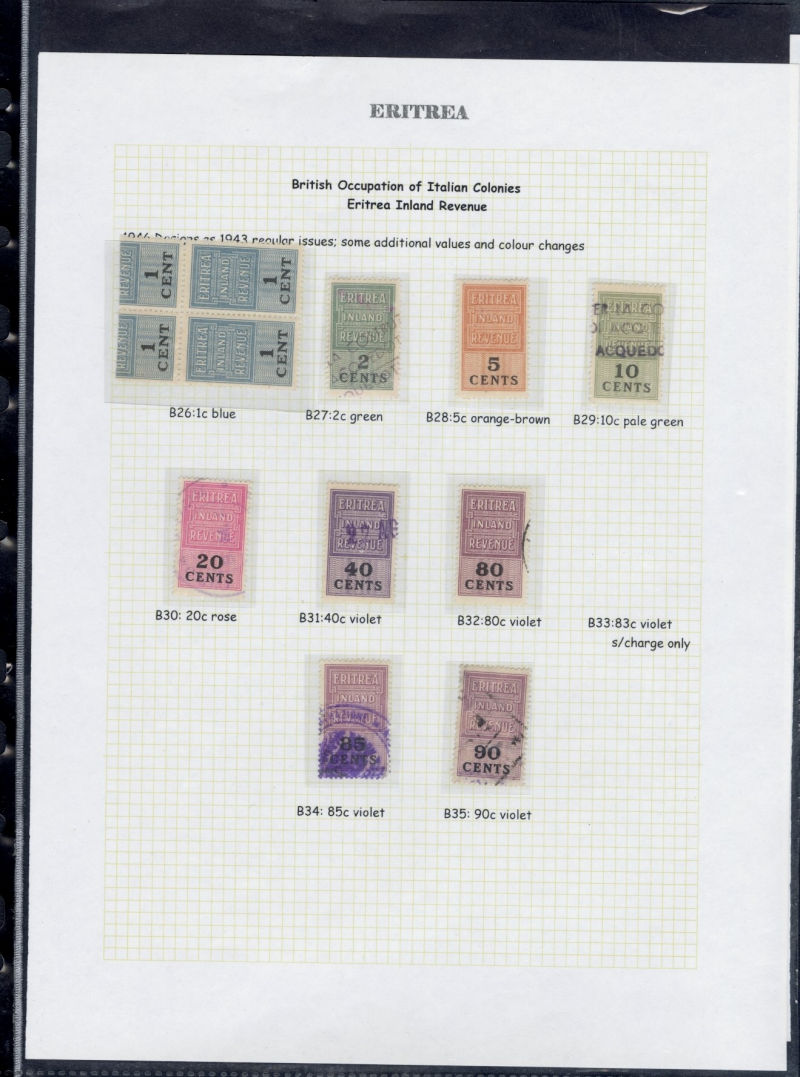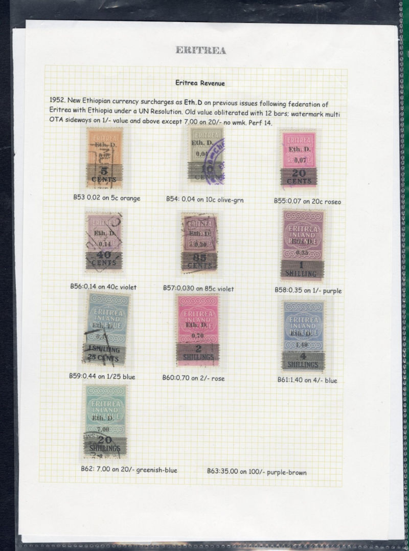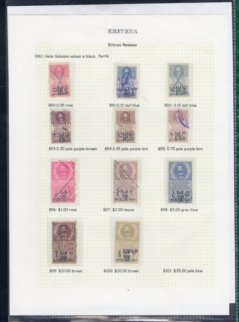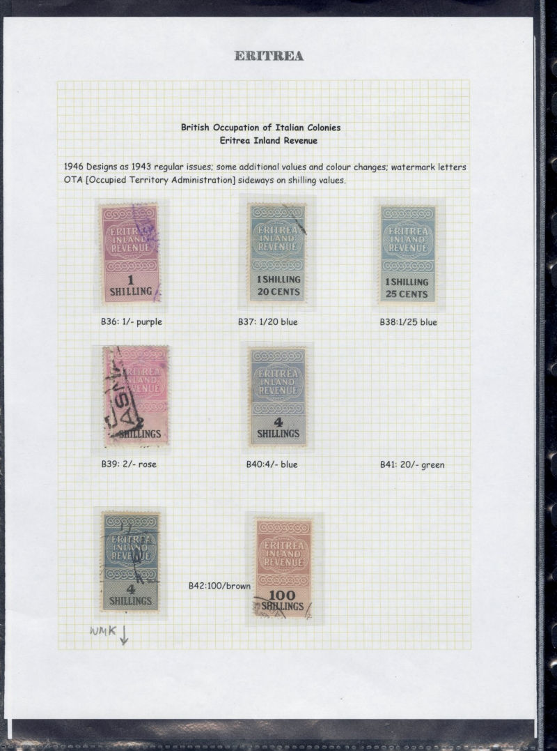 1147 O, og   imageLARGE LOTS AND COLLECTIONS ITALIAN COLONIES Revenue Stamps 1896-1961 Eritrea, collection on pages, used and unused values to 50 Lire, occasional multiples, documents, "Tassa Camerale Polizze de Carico" (Chamber of Commerce Tax Bills of Lading), Eritrea Municipal Tax, Automobile Tax, overprinted "A.O.I.", British Occupation "Eritrean Inland Revenue", values in East African Shillings, later issues with portrait of Haile Selassie, etc., scarce lot (2013 Barefoot catalogue £4,500+, not counting documents or multiples) (Image) (Image 2) (Image 3) (Image 4) (Image 5) (Image 6) (Image 7) (Image 8) (Image 9) (Image 10) (Image 11) (Image 12) (Image 13) (Image 14) (Image 15) (Image 16) (Image 17) (Image 18) (Image 19) (Image 20) (Image 21) (Image 22) (Image 23) (Image 24) (Image 25) (Image 26) (Image 27) (Image 28) (Image 29) (Image 30) (Image 31) (Image 32) (Image 33) (Image 34) (All Images)