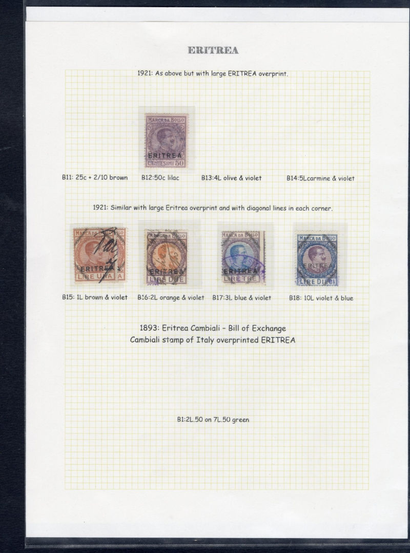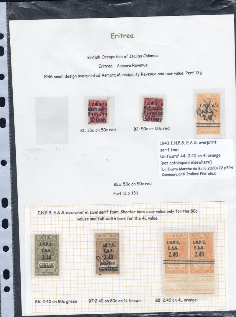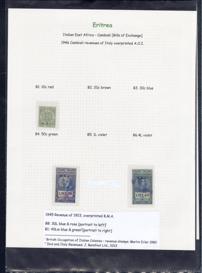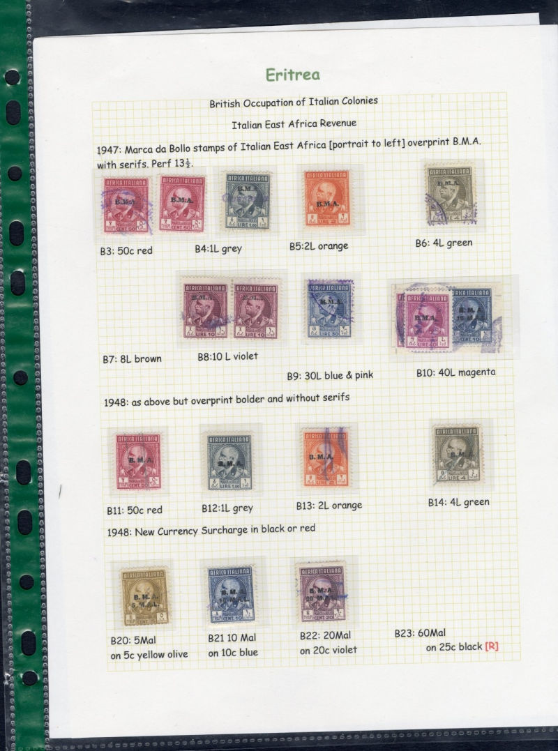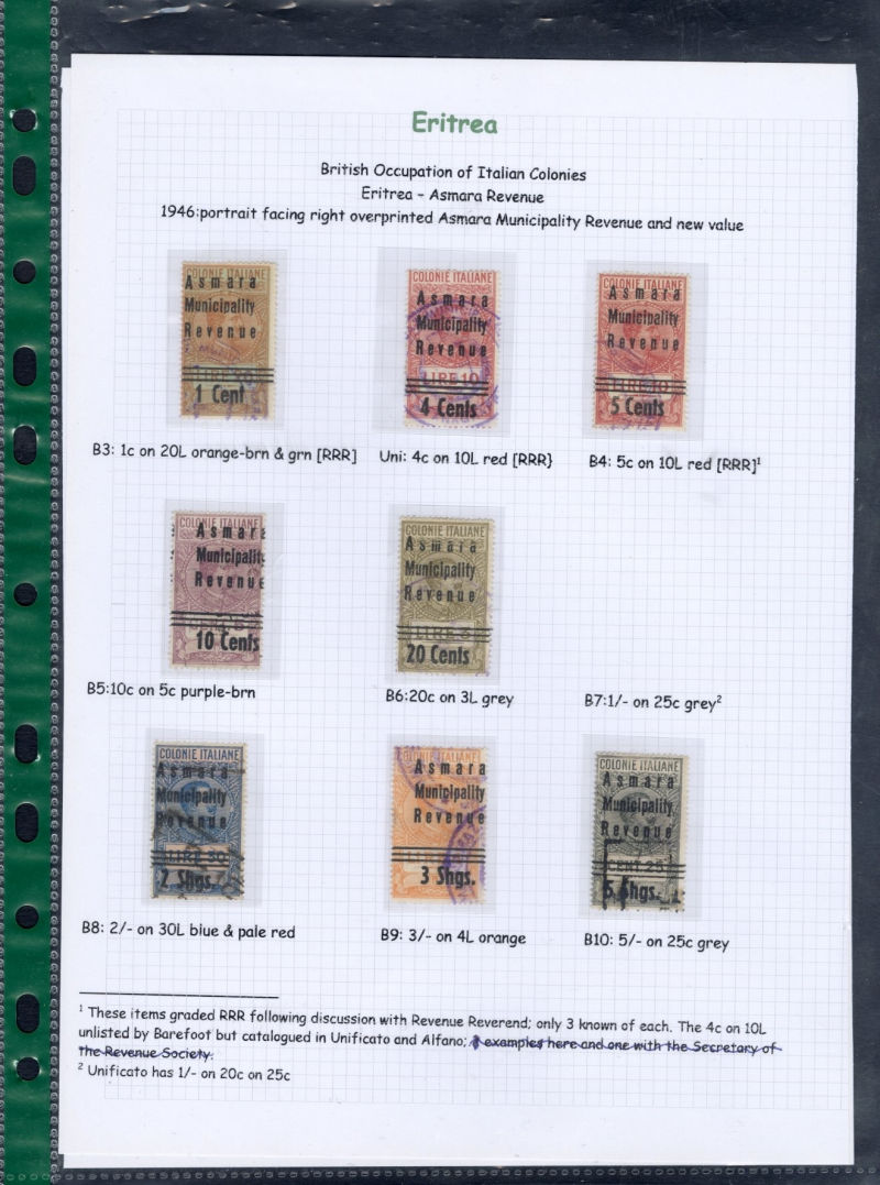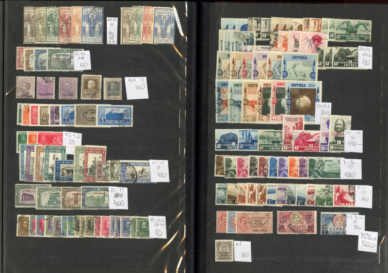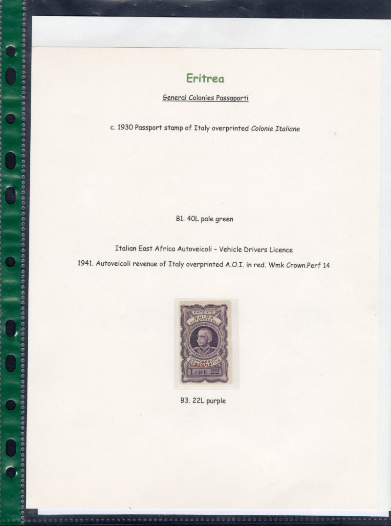 1147 O, og   imageLARGE LOTS AND COLLECTIONS ITALIAN COLONIES Revenue Stamps 1896-1961 Eritrea, collection on pages, used and unused values to 50 Lire, occasional multiples, documents, "Tassa Camerale Polizze de Carico" (Chamber of Commerce Tax Bills of Lading), Eritrea Municipal Tax, Automobile Tax, overprinted "A.O.I.", British Occupation "Eritrean Inland Revenue", values in East African Shillings, later issues with portrait of Haile Selassie, etc., scarce lot (2013 Barefoot catalogue £4,500+, not counting documents or multiples) (Image) (Image 2) (Image 3) (Image 4) (Image 5) (Image 6) (Image 7) (Image 8) (Image 9) (Image 10) (Image 11) (Image 12) (Image 13) (Image 14) (Image 15) (Image 16) (Image 17) (Image 18) (Image 19) (Image 20) (Image 21) (Image 22) (Image 23) (Image 24) (Image 25) (Image 26) (Image 27) (Image 28) (Image 29) (Image 30) (Image 31) (Image 32) (Image 33) (Image 34) (All Images)