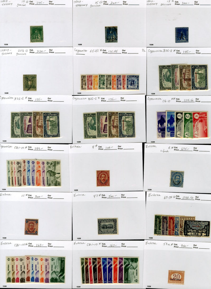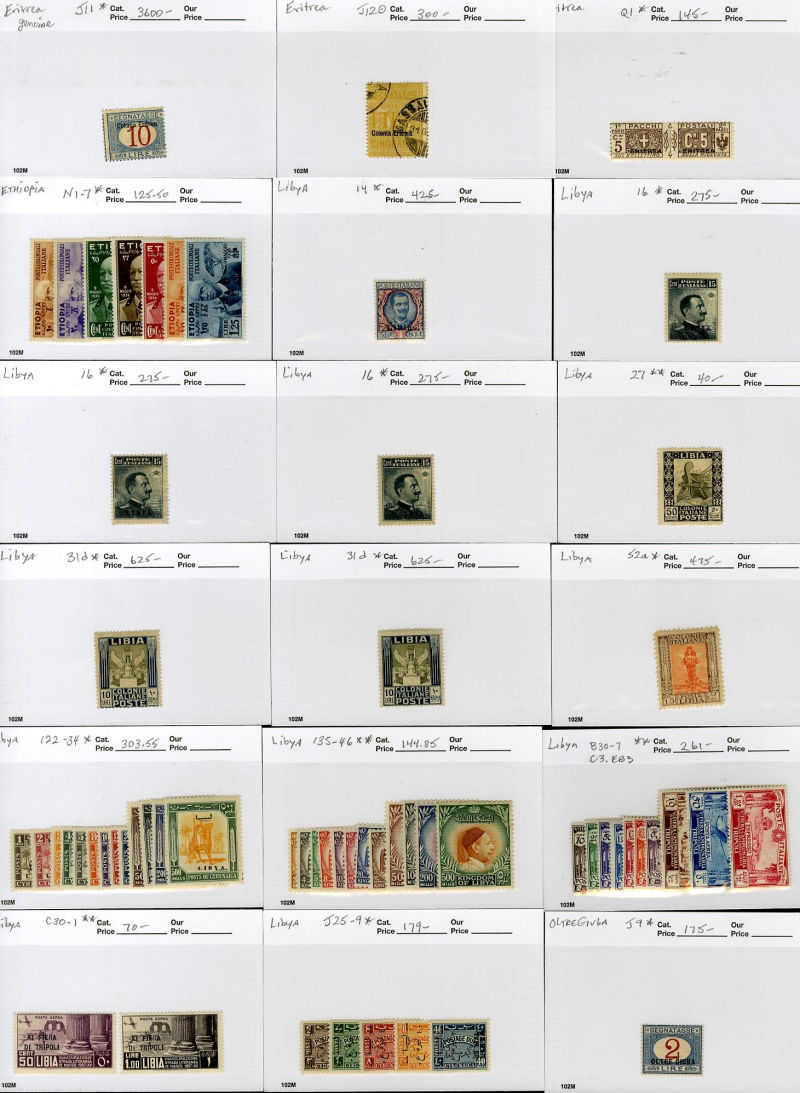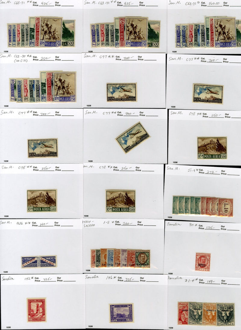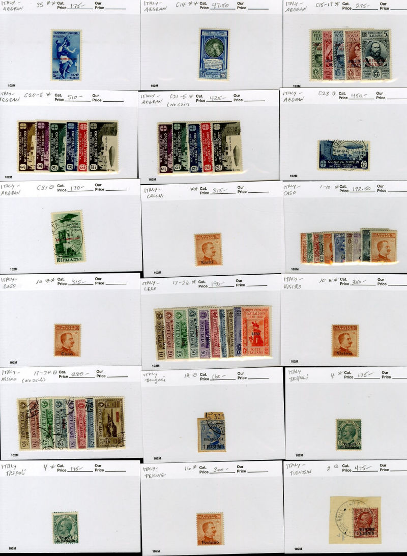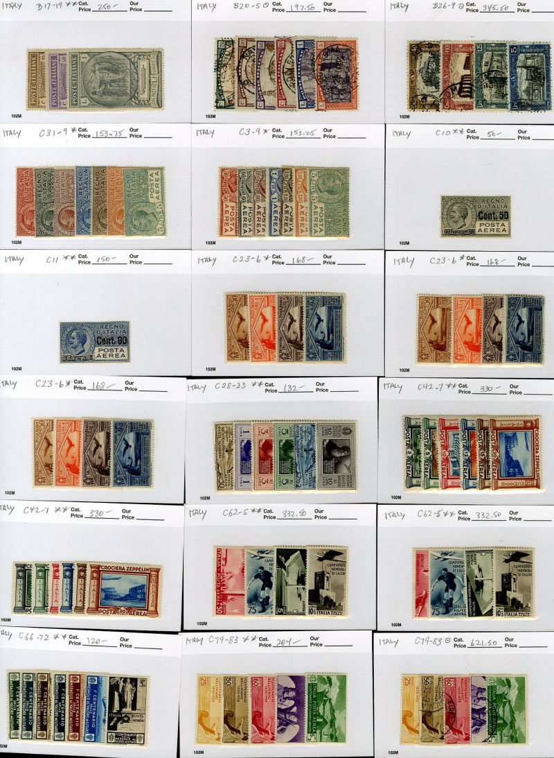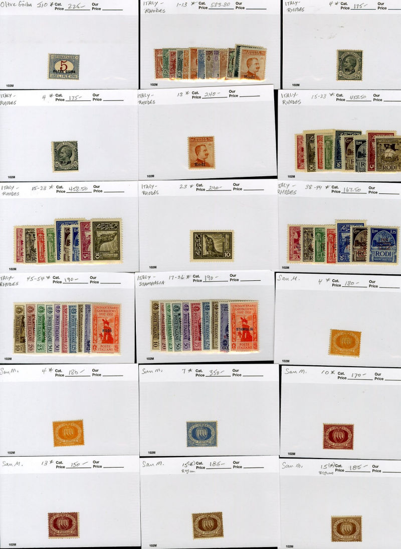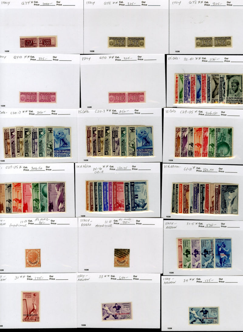 1144 O, og   imageLARGE LOTS AND COLLECTIONS ITALY AND COLONIES 1900-50 selection on cards, identified and priced by Scott, used and unused Italy with better singles and sets including Victor Emmanuel, Philatelic Congress, Manzoni, Virgil, Dante, Garibaldi, March on Rome, Medal of Valor, Bellini, Children, 100L Republica (8 copies), Risorgimento, Air Post, Zeppelin (2), Football (2), Postage Dues, Parcel Post, etc., Italian Colonies with Offices Abroad, East Africa, Aegean Islands, Cyrenaica, Eritrea, Libya and Tripolitania, some Italian States including Tuscany; San Marino with Air Post, Trieste, and more, mixed condition, small faults possible, cat. $100,000+ not counting dubious items. An excellent assembly, with many valuable items, ready for immediate resale (Image) (Image 2) (Image 3) (Image 4) (Image 5) (Image 6) (Image 7) (Image 8) (Image 9) (Image 10) (Image 11) (Image 12) (Image 13) (Image 14) (Image 15) (Image 16) (Image 17) (Image 18) (Image 19) (Image 20) (All Images)