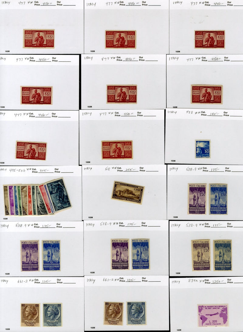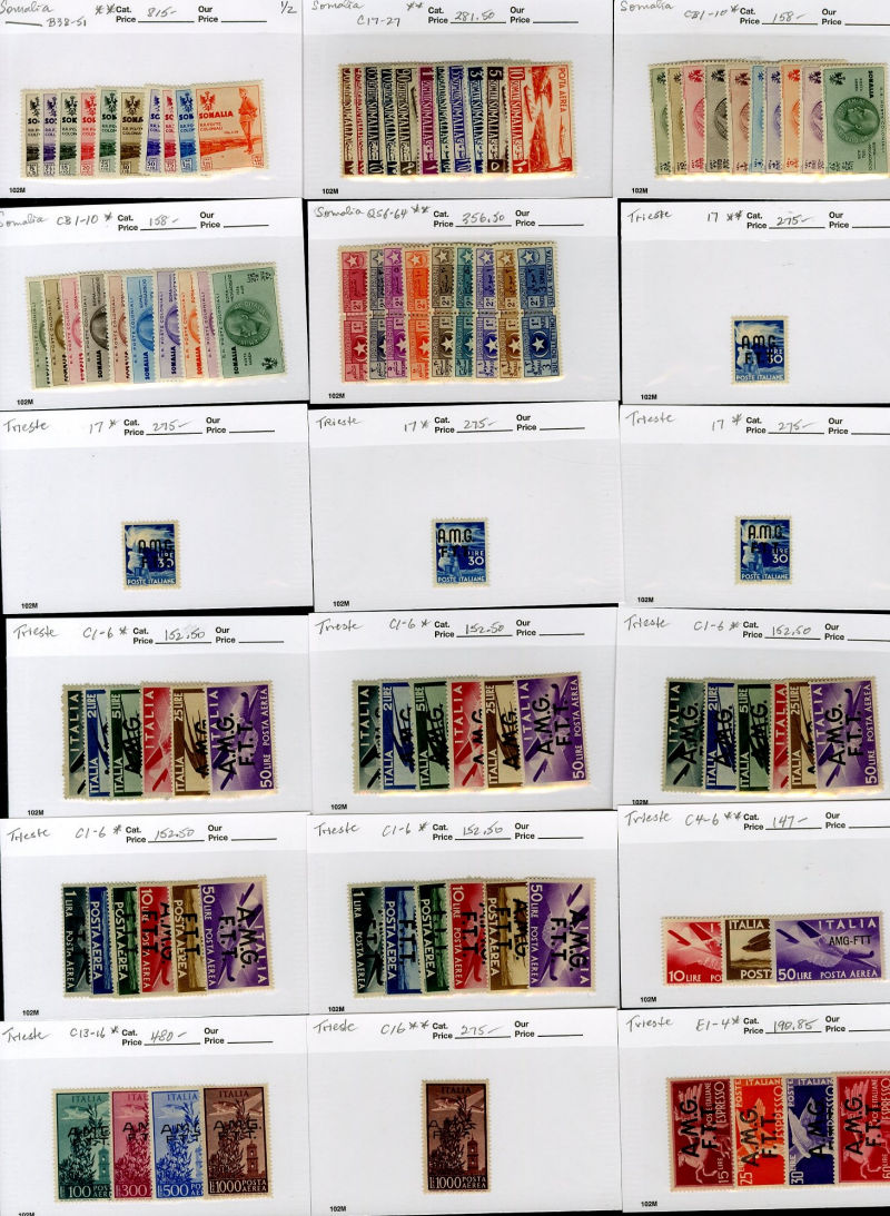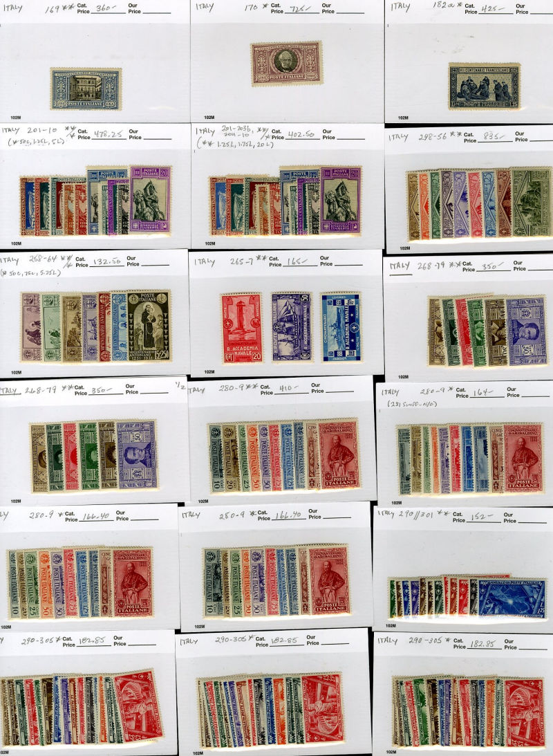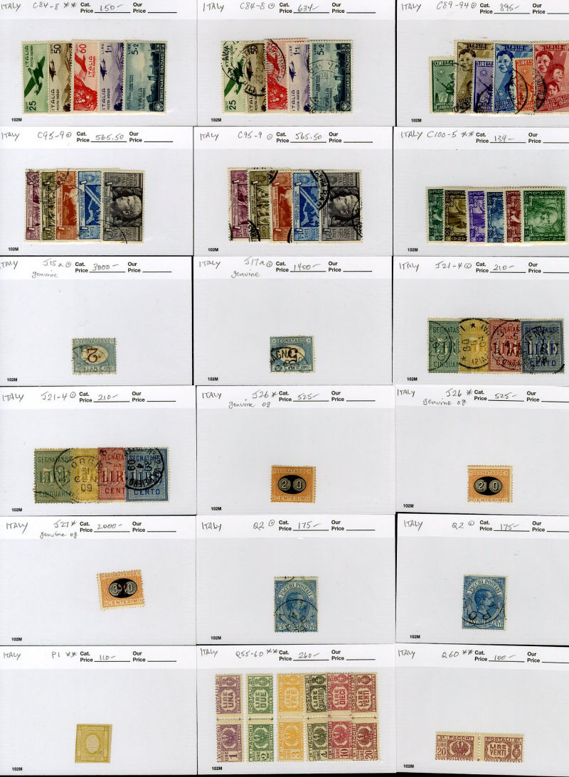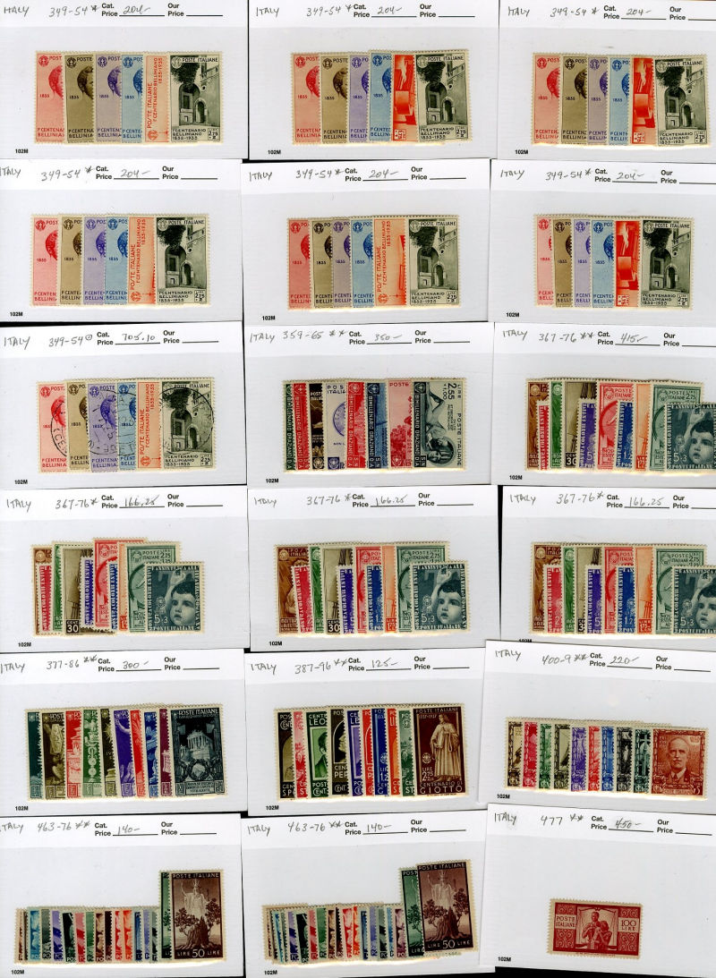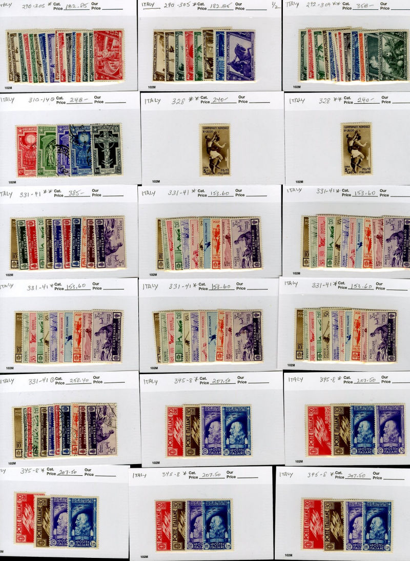 1144 O, og   imageLARGE LOTS AND COLLECTIONS ITALY AND COLONIES 1900-50 selection on cards, identified and priced by Scott, used and unused Italy with better singles and sets including Victor Emmanuel, Philatelic Congress, Manzoni, Virgil, Dante, Garibaldi, March on Rome, Medal of Valor, Bellini, Children, 100L Republica (8 copies), Risorgimento, Air Post, Zeppelin (2), Football (2), Postage Dues, Parcel Post, etc., Italian Colonies with Offices Abroad, East Africa, Aegean Islands, Cyrenaica, Eritrea, Libya and Tripolitania, some Italian States including Tuscany; San Marino with Air Post, Trieste, and more, mixed condition, small faults possible, cat. $100,000+ not counting dubious items. An excellent assembly, with many valuable items, ready for immediate resale (Image) (Image 2) (Image 3) (Image 4) (Image 5) (Image 6) (Image 7) (Image 8) (Image 9) (Image 10) (Image 11) (Image 12) (Image 13) (Image 14) (Image 15) (Image 16) (Image 17) (Image 18) (Image 19) (Image 20) (All Images)