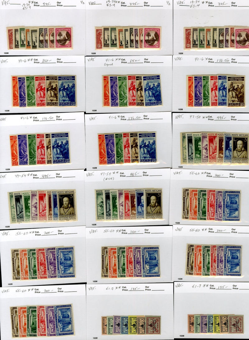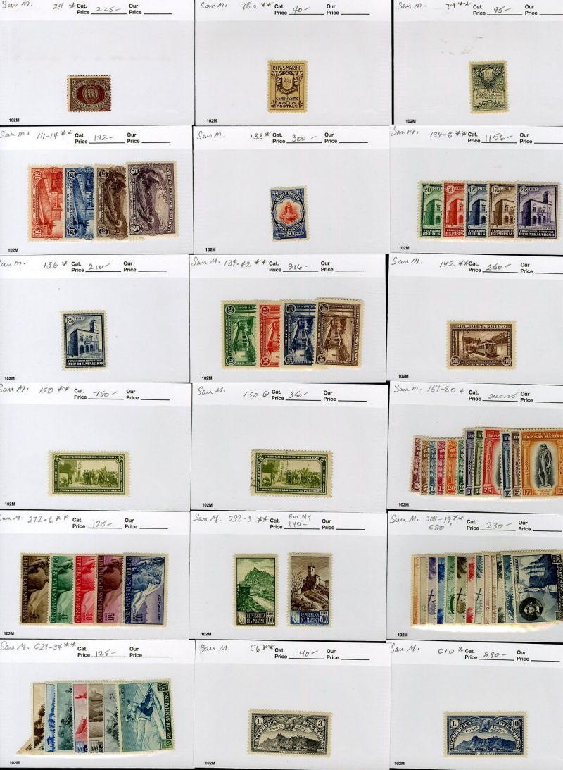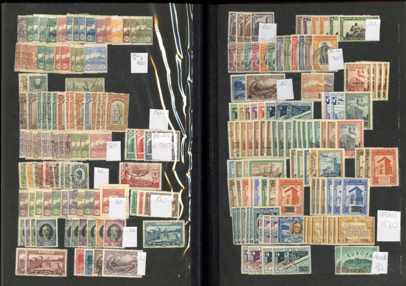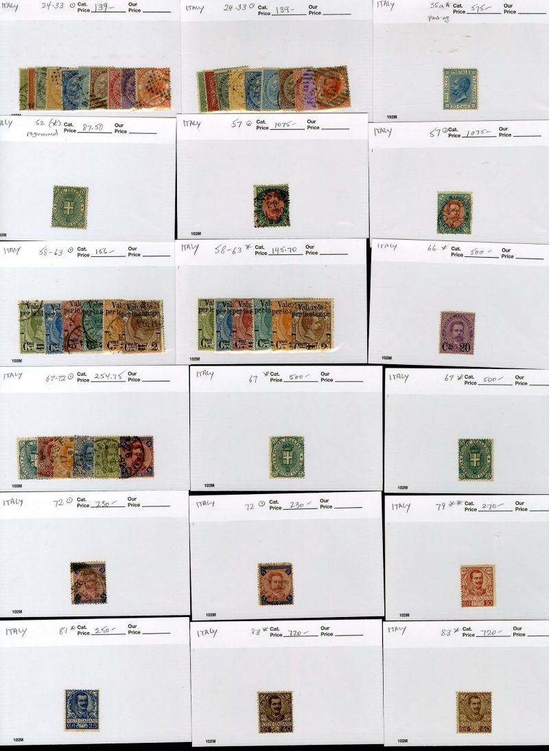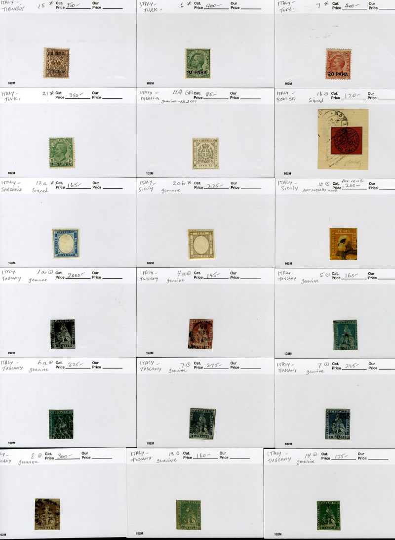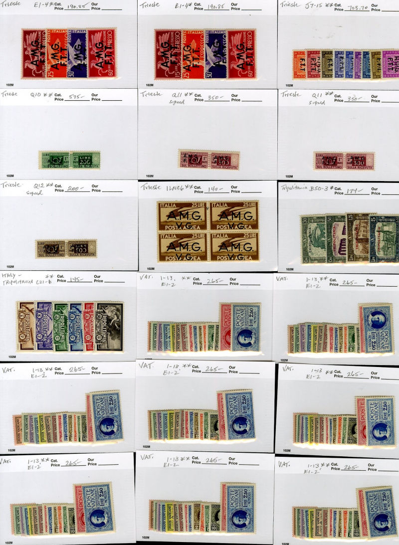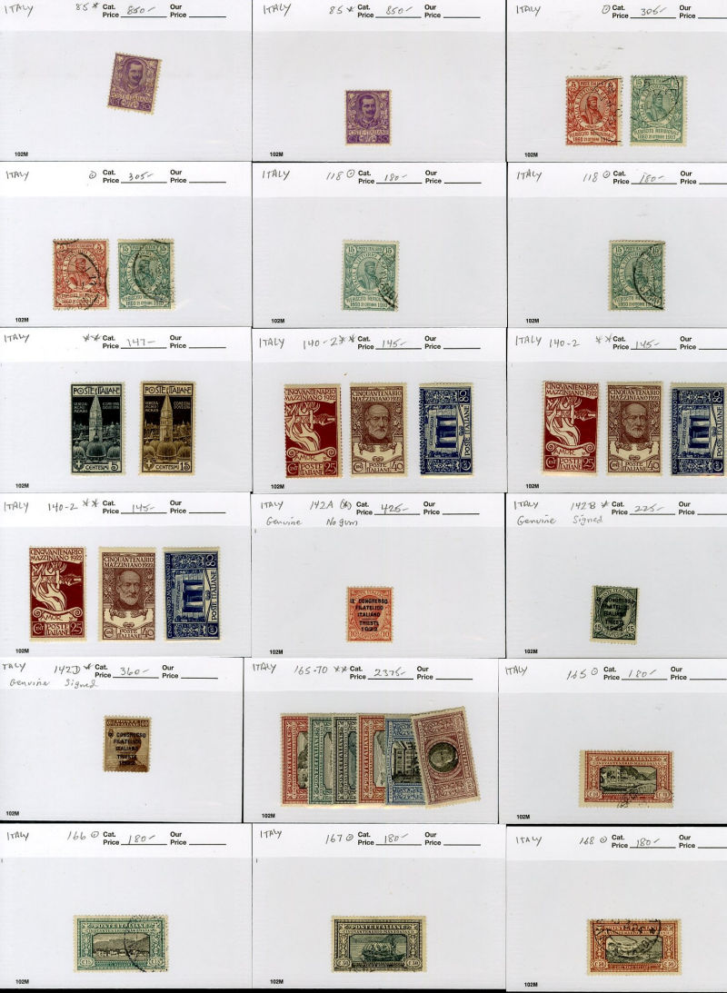 1144 O, og   imageLARGE LOTS AND COLLECTIONS ITALY AND COLONIES 1900-50 selection on cards, identified and priced by Scott, used and unused Italy with better singles and sets including Victor Emmanuel, Philatelic Congress, Manzoni, Virgil, Dante, Garibaldi, March on Rome, Medal of Valor, Bellini, Children, 100L Republica (8 copies), Risorgimento, Air Post, Zeppelin (2), Football (2), Postage Dues, Parcel Post, etc., Italian Colonies with Offices Abroad, East Africa, Aegean Islands, Cyrenaica, Eritrea, Libya and Tripolitania, some Italian States including Tuscany; San Marino with Air Post, Trieste, and more, mixed condition, small faults possible, cat. $100,000+ not counting dubious items. An excellent assembly, with many valuable items, ready for immediate resale (Image) (Image 2) (Image 3) (Image 4) (Image 5) (Image 6) (Image 7) (Image 8) (Image 9) (Image 10) (Image 11) (Image 12) (Image 13) (Image 14) (Image 15) (Image 16) (Image 17) (Image 18) (Image 19) (Image 20) (All Images)