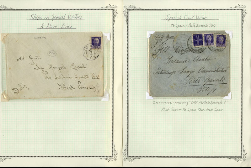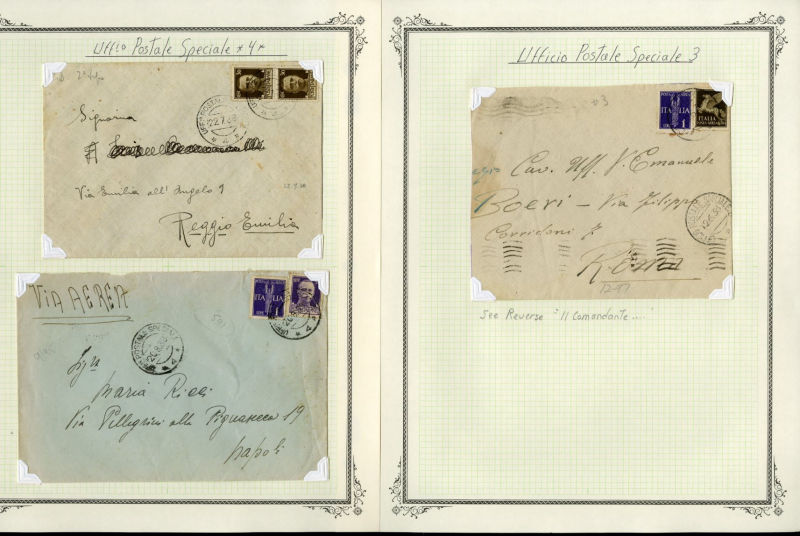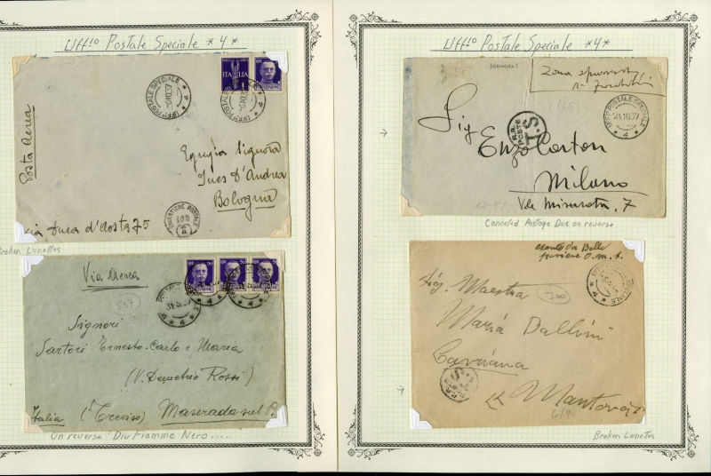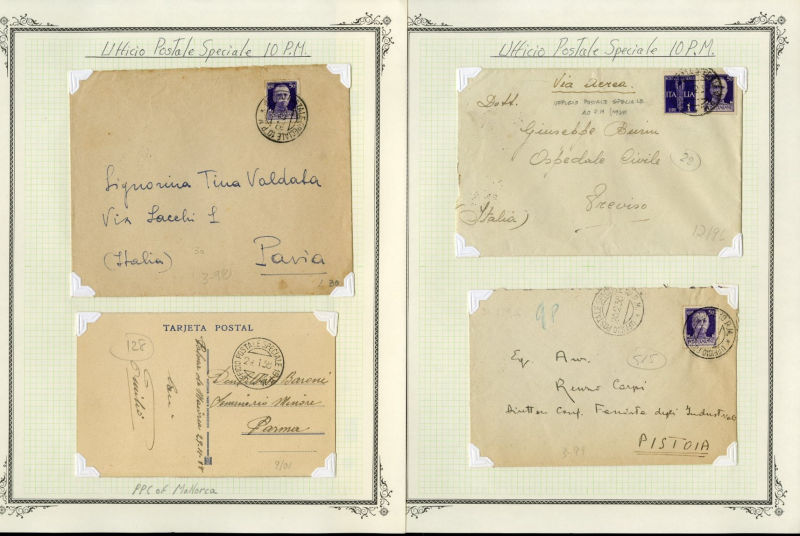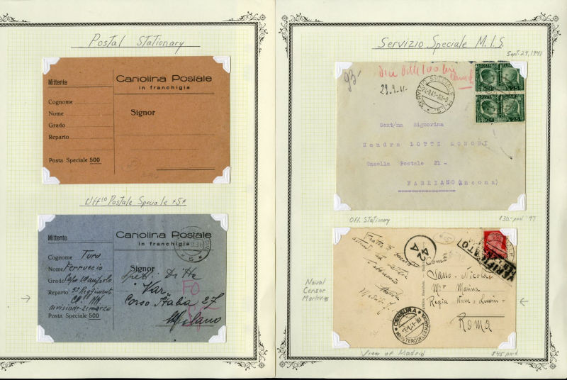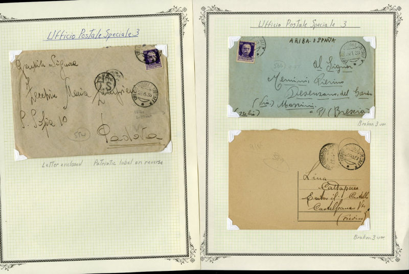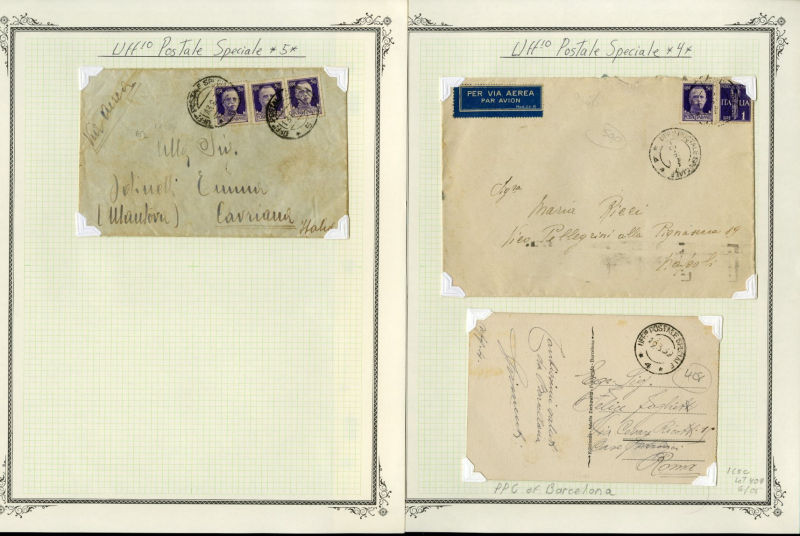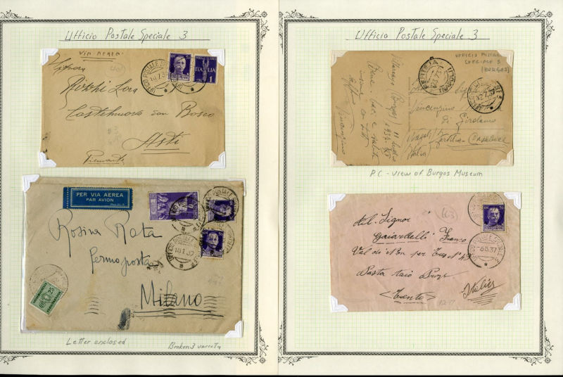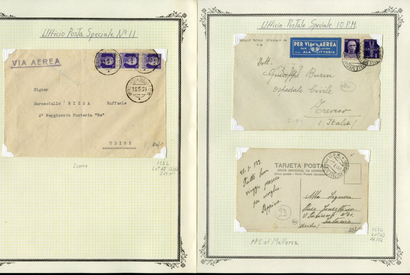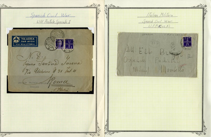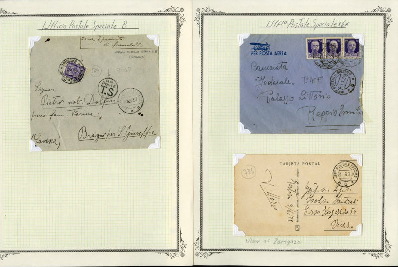 1145 c   imageLARGE LOTS AND COLLECTIONS ITALY - Covers and Postal History Military Mail 1937-42 Italian "volunteers" during the Spanish Civil War, collection of 65+ covers and cards, with different "Ufficio Postal Speciale" (1-11) markings from Spain to Italy, mostly with Italian franking (occasional internal usage), or free-frank (some charged postage due on arrival), also WWII "Servizio Speciale M.I.S" (Italian Mission in Spain), some censor markings, postal stationery and picture postcards, mixed condition, interesting lot (Image) (Image 2) (Image 3) (Image 4) (Image 5) (Image 6) (Image 7) (Image 8) (Image 9) (Image 10) (Image 11) (Image 12) (Image 13) (Image 14) (Image 15) (Image 16) (Image 17) (Image 18) (Image 19) (Image 20) (Image 21) (Image 22) (Image 23) (Image 24) (All Images)