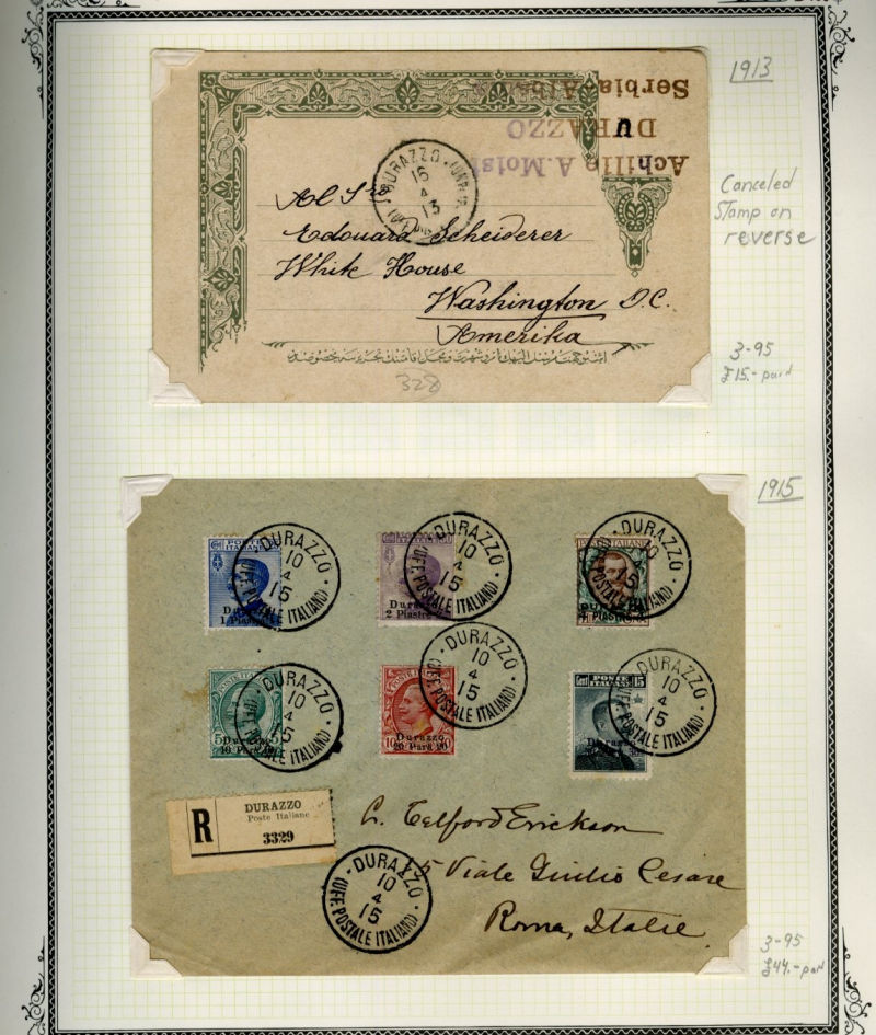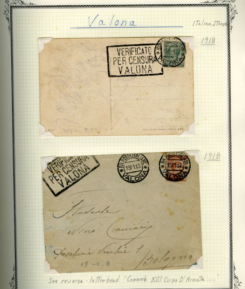 1148 c   imageLARGE LOTS AND COLLECTIONS ITALIAN OCCUPATION OF ALBANIA 1908-42 advanced collection on pages, 150+ covers and cards, with Italian Military mail during WWI ("Posta Militare Truppe Ocupazione" markings), stamps overprinted for Albania, Janina, Durazzo, Scutari, Saseno and Valona, different unit markings, censor cachets, destinations, some Austria Army units, also WWII stamps and covers, military cards, picture postcards, Naval cancels, plus others, interesting and unusual collection (Image) (Image 2) (Image 3) (Image 4) (Image 5) (Image 6) (Image 7) (Image 8) (All Images)