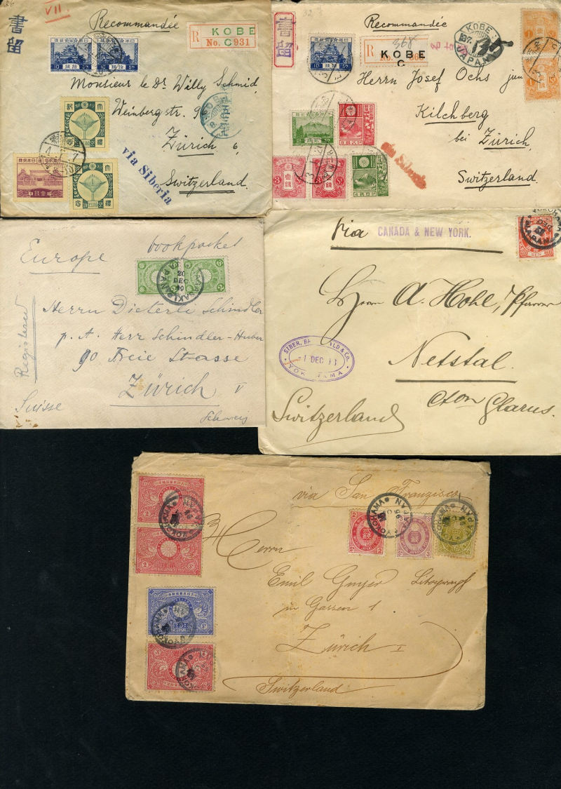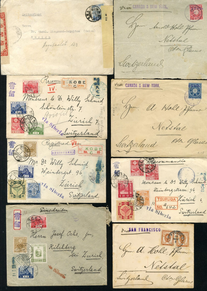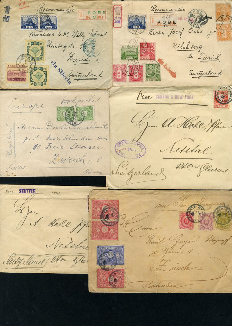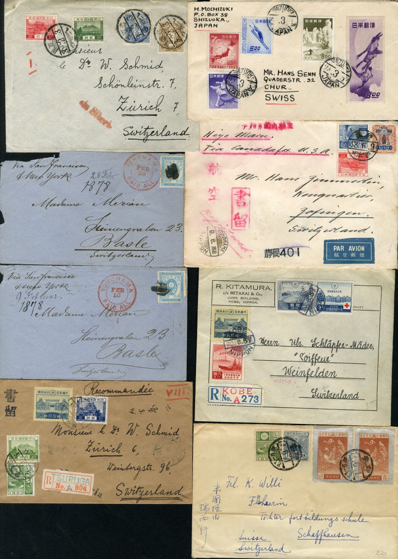 1150 c   imageLARGE LOTS AND COLLECTIONS JAPAN - Covers and Postal History 1878-1950 selection of 22 covers or cards (plus one coverfront), mostly correspondence from Yokohama and Kobe to Switzerland, different combination frankings, rates, forwarding markings, Registered and Censor labels, mixed condition, some faults noted, mostly fine and attractive commercially used group of covers from Japan (Image) (Image 2) (Image 3) (Image 4) (Image 5) (All Images)