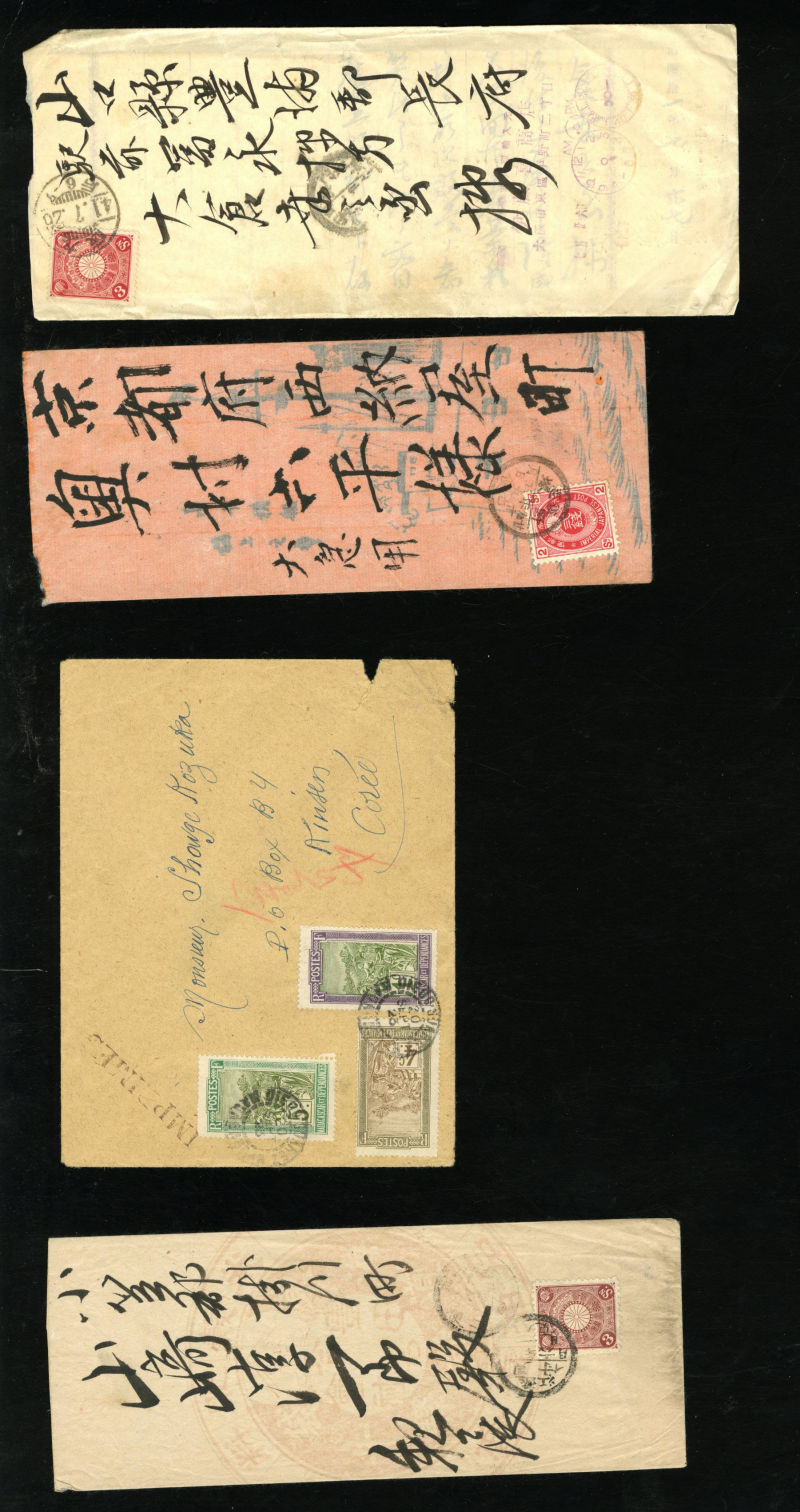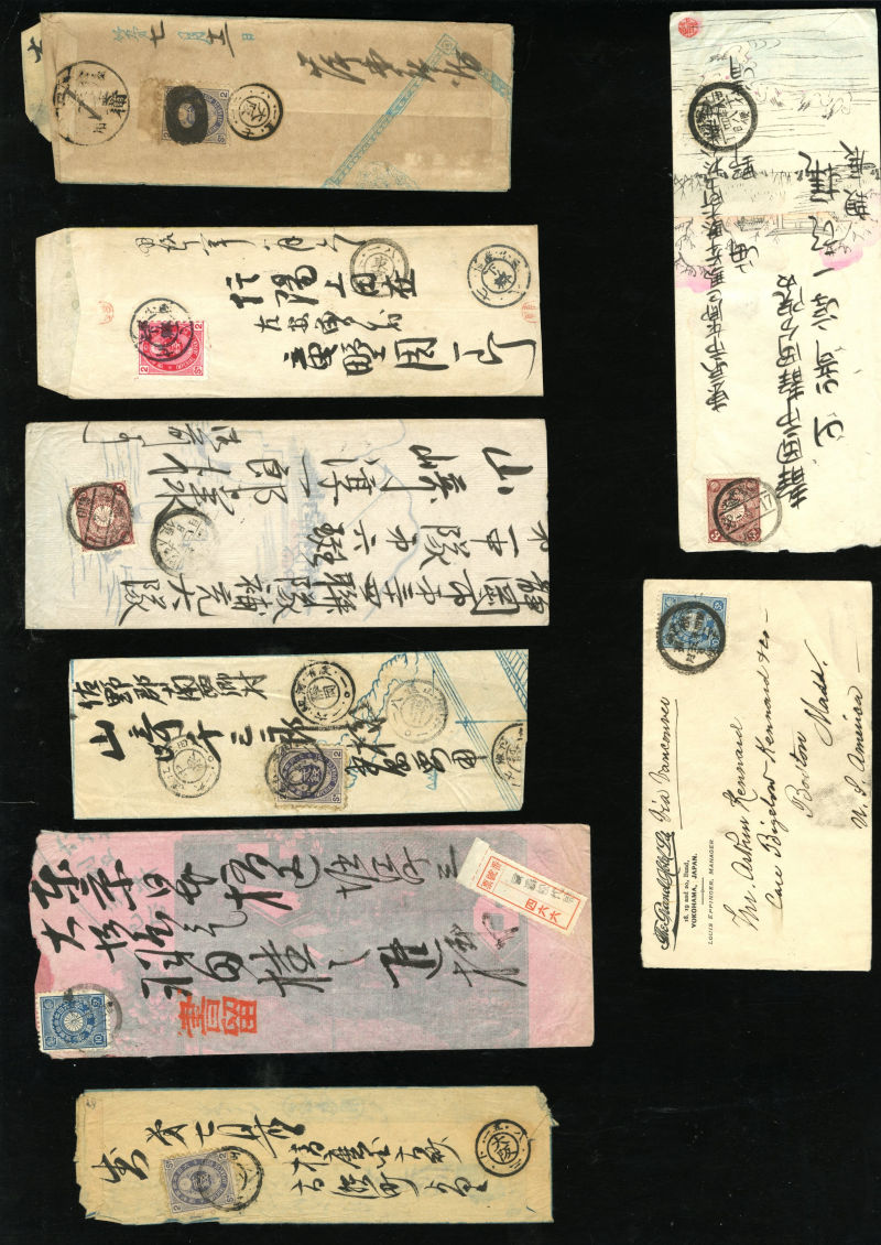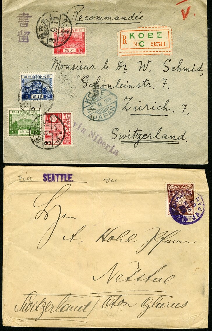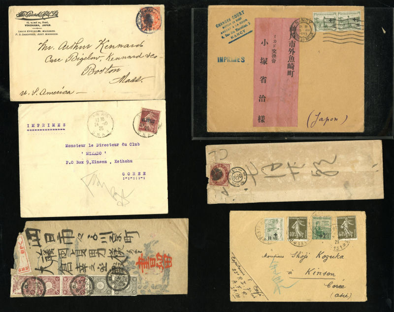 1150 c   imageLARGE LOTS AND COLLECTIONS JAPAN - Covers and Postal History 1878-1950 selection of 22 covers or cards (plus one coverfront), mostly correspondence from Yokohama and Kobe to Switzerland, different combination frankings, rates, forwarding markings, Registered and Censor labels, mixed condition, some faults noted, mostly fine and attractive commercially used group of covers from Japan (Image) (Image 2) (Image 3) (Image 4) (Image 5) (All Images)