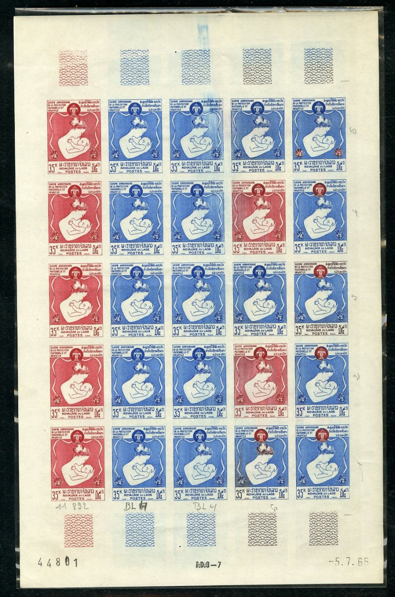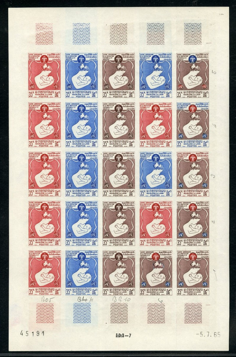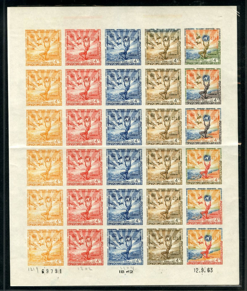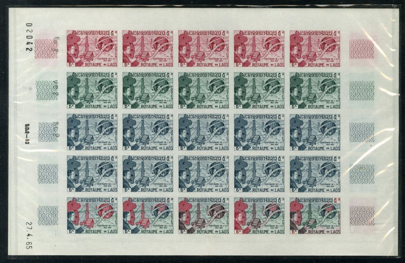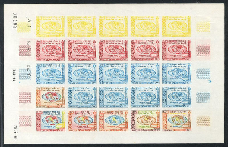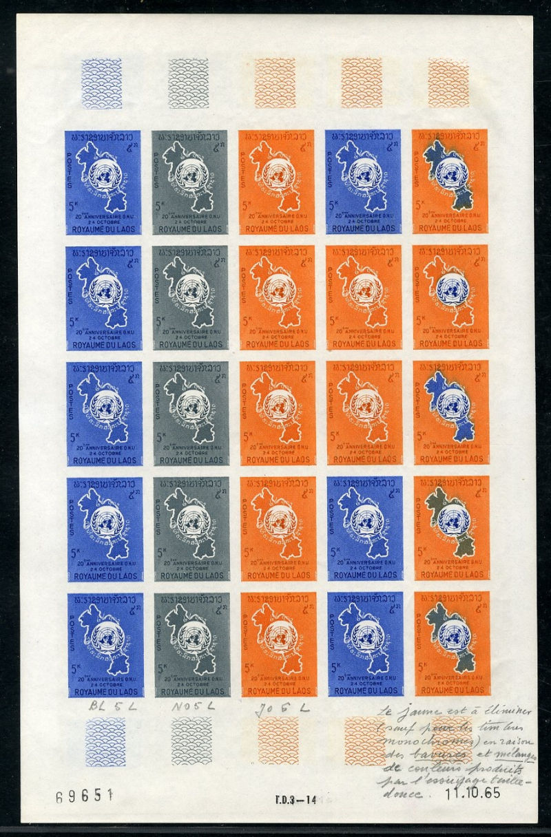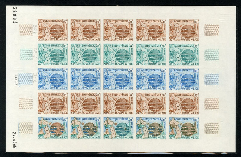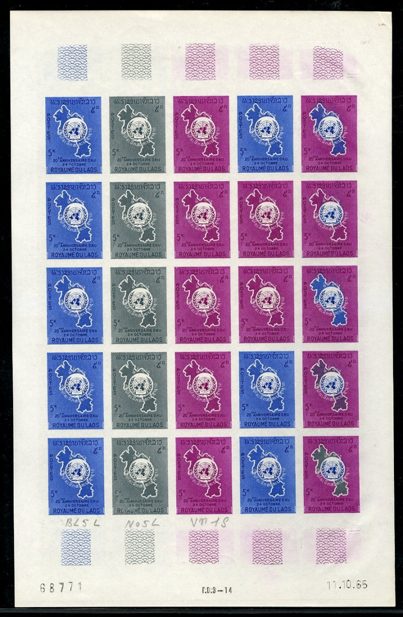1153 P, bl   imageLARGE LOTS AND COLLECTIONS LAOS 1963-65 selection of eight different imperforate sheets of 25 (one sheet of 30), gummed trial color proofs (205 stamps), Human Rights, United Nations, U.I.T., etc., n.h., v.f., attractive group (Image) (Image 2) (Image 3) (Image 4) (Image 5) (Image 6) (Image 7) (Image 8) (All Images)