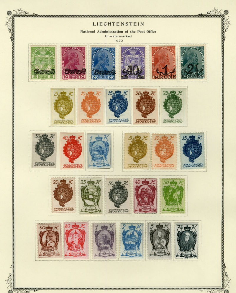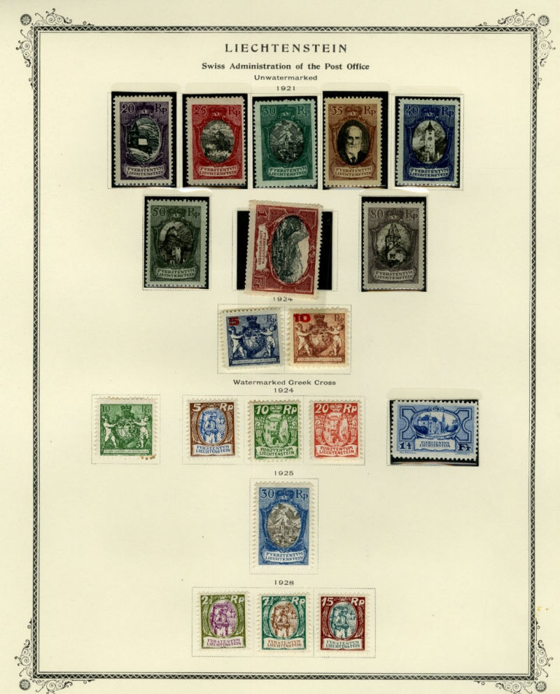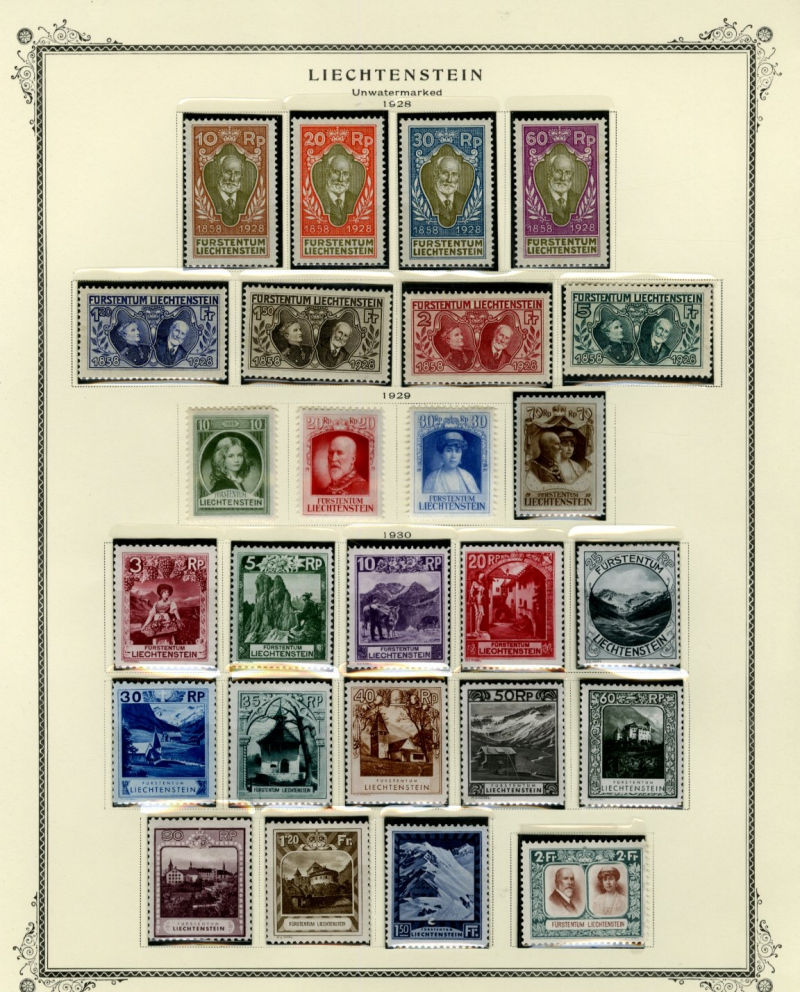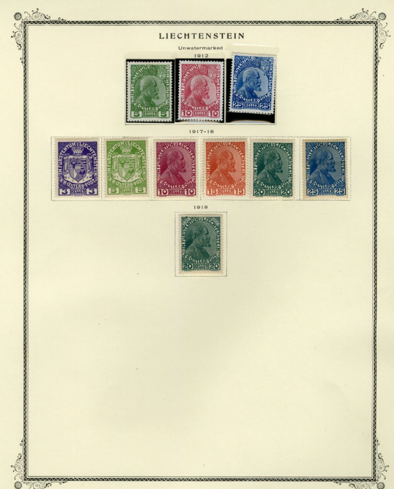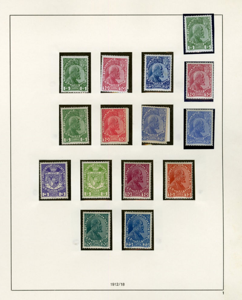 1154 nh   imageLARGE LOTS AND COLLECTIONS LIECHTENSTEIN 1912-1965 collection on SAFE album pages, issues complete (without air post and back of the book) including all three varieties of 1912-15 Prince Johann, 25h dark blue, ultramarine, chalky and unsurfaced paper (Scott 1-3,1a-3a,3b), 1921 definitives perf. 9 1/2 & 12 1/2, pictorials and commemoratives, Coat of Arms, Vaduz souvenir sheet, etc., mostly n.h., fine-v.f. (Image) (Image 2) (Image 3) (Image 4) (Image 5) (Image 6) (Image 7) (Image 8) (Image 9) (Image 10) (Image 11) (Image 12) (All Images)