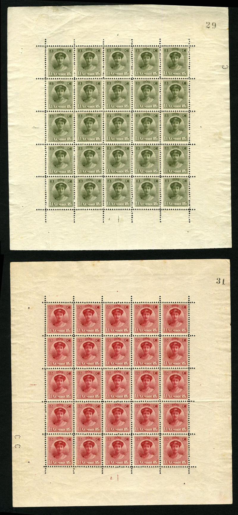1157 O, nh, bl   imageLARGE LOTS AND COLLECTIONS LUXEMBOURG 1906-47 wholesale group of sheets of 25, sheetlets of five, souvenir sheets, etc., moderate quantities, some hinged, mostly n.h., few used, fine-v.f., cat. value $5418 (Image) (Image 2) (All Images)