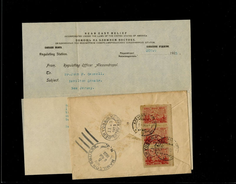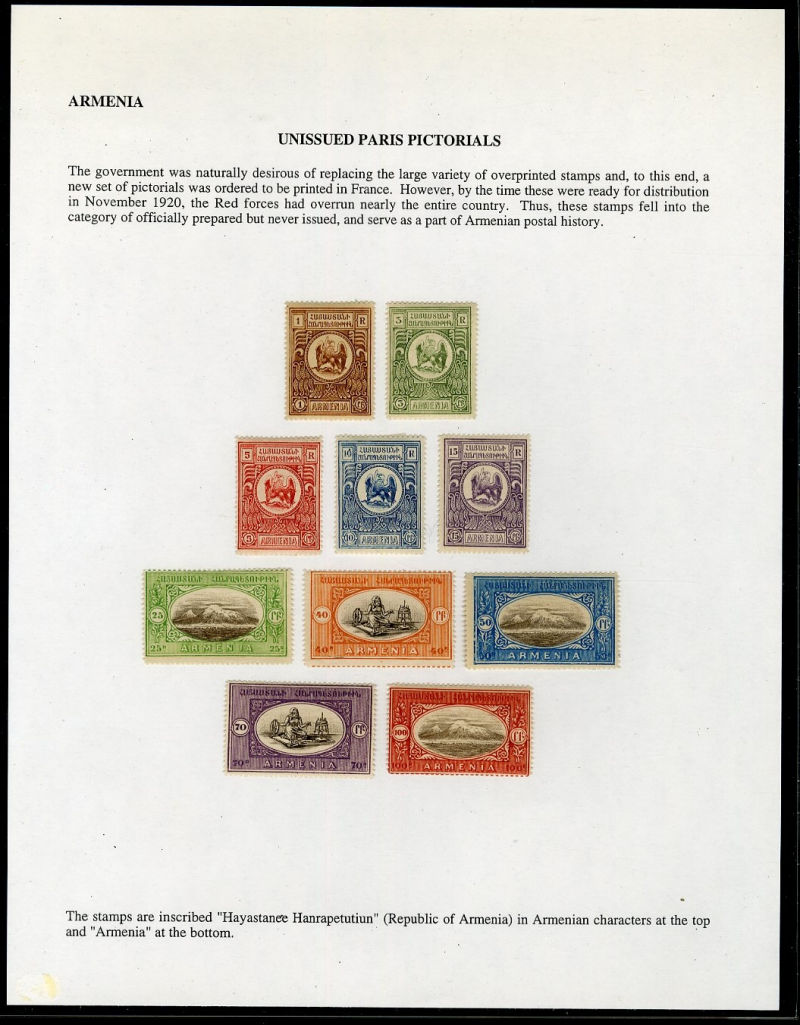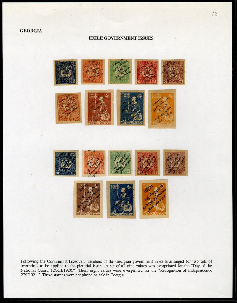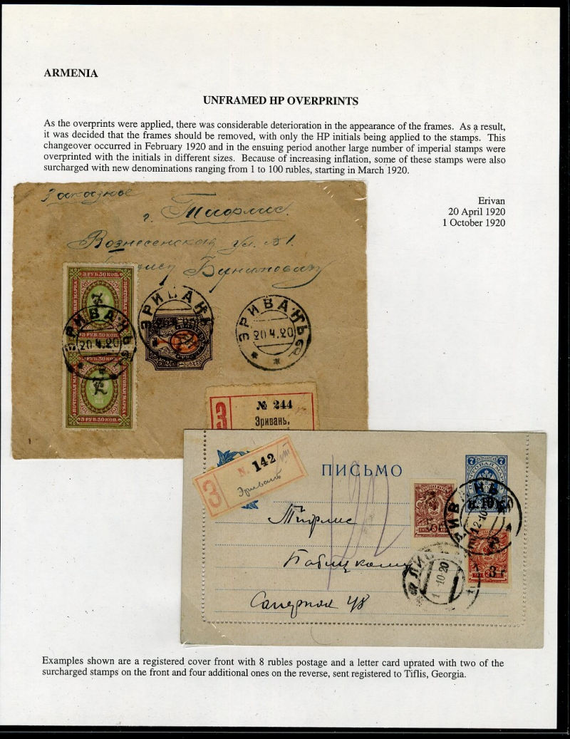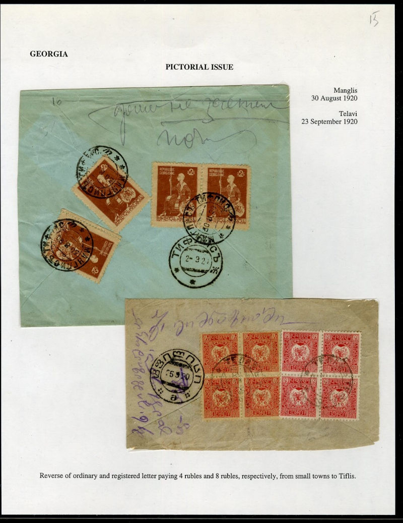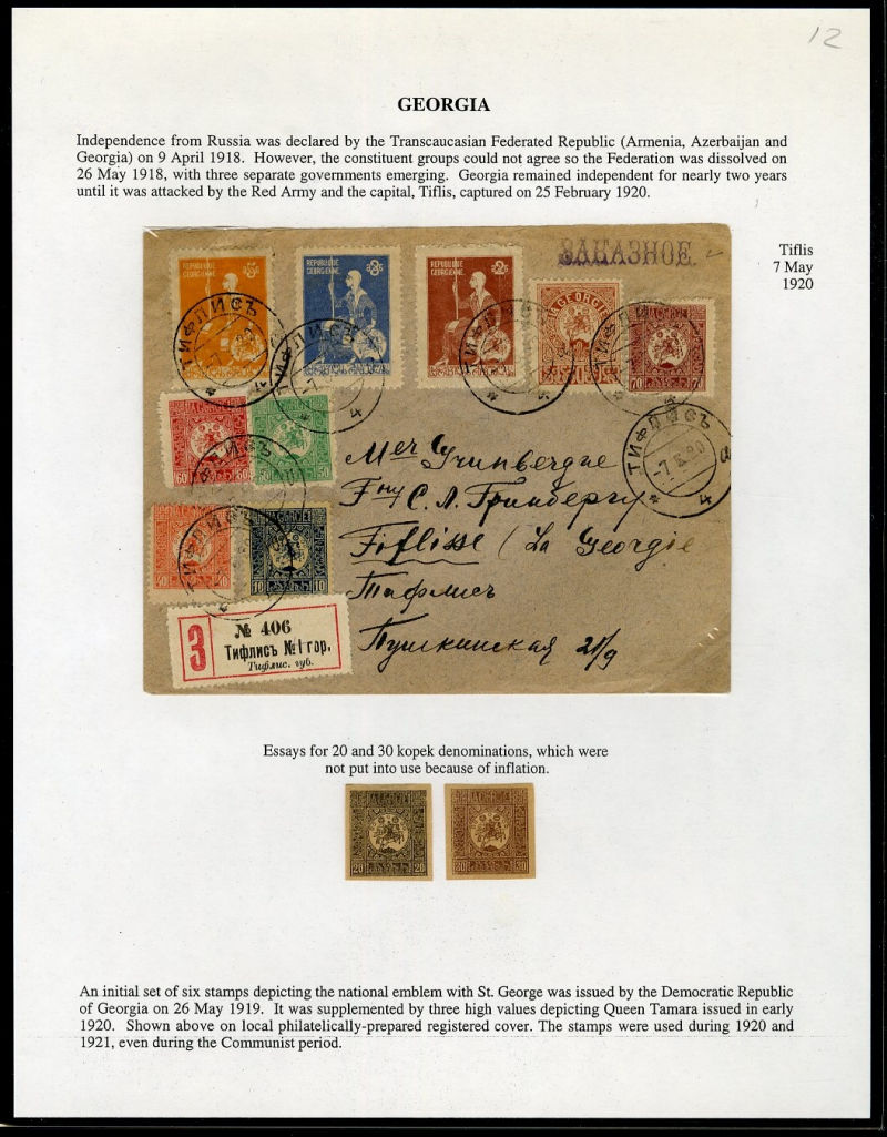 1184 c   imageLARGE LOTS AND COLLECTIONS RUSSIA - FORMER RUSSIAN REPUBLICS 1920 selection on six exhibit pages, with Armenia, registered card and cover, also stationery card with additional franking sent from Erevan to Tiflis, cover and letter from the Near East Relief Caucasus Branch, unissued Pictorials, George Government in Exile issues, two proofs and registered cover with attractive franking, fine-v.f., ex-Al Kugel (Image) (Image 2) (Image 3) (Image 4) (Image 5) (Image 6) (Image 7) (All Images)
