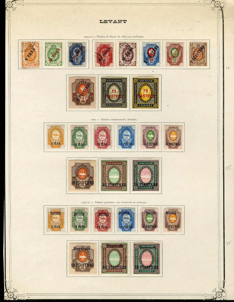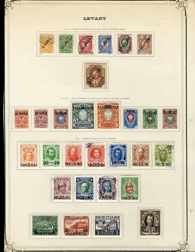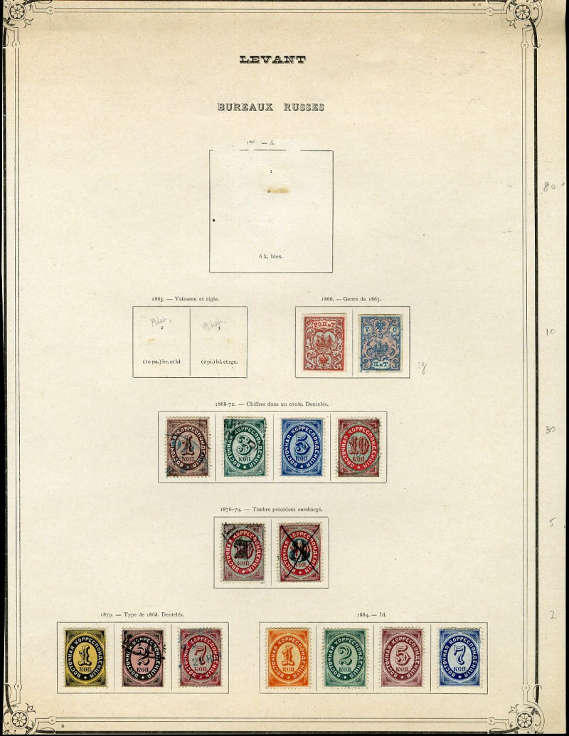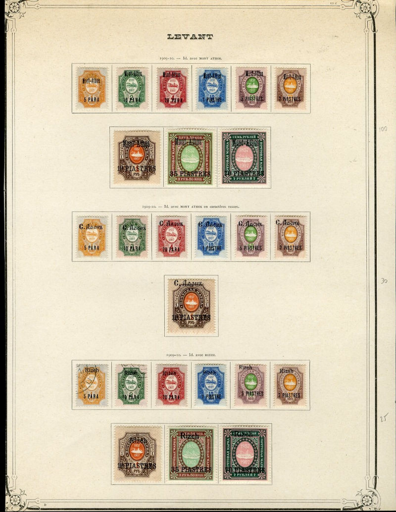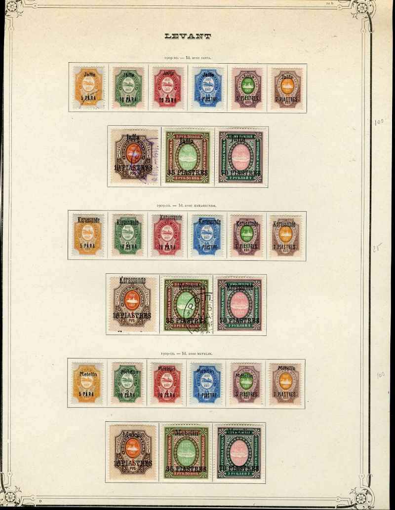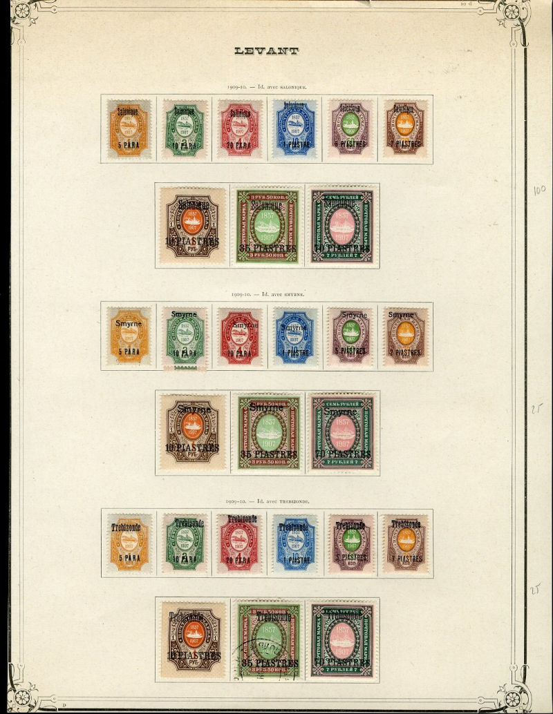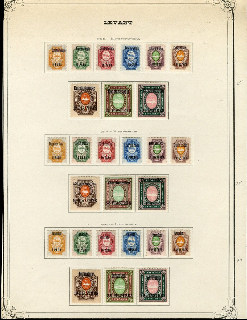 1185 O, og   imageLARGE LOTS AND COLLECTIONS RUSSIAN OFFICES IN THE TURKISH EMPIRE 1866-1913 issues complete, collection on pages, used or unused, with Cities overprints, Romanov surcharges, etc., fine-v.f. (Image) (Image 2) (Image 3) (Image 4) (Image 5) (Image 6) (Image 7) (All Images)