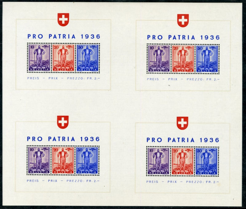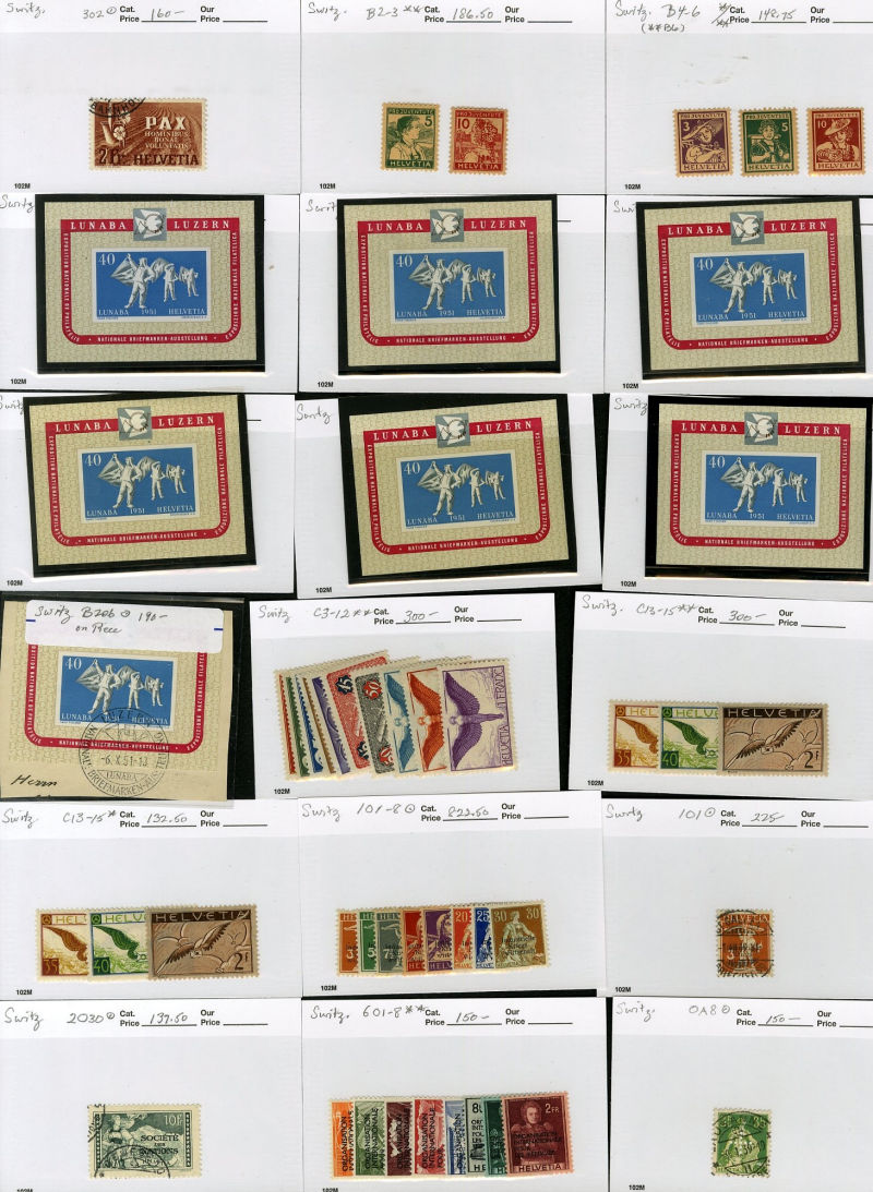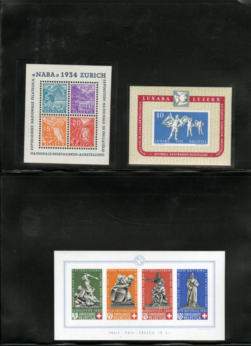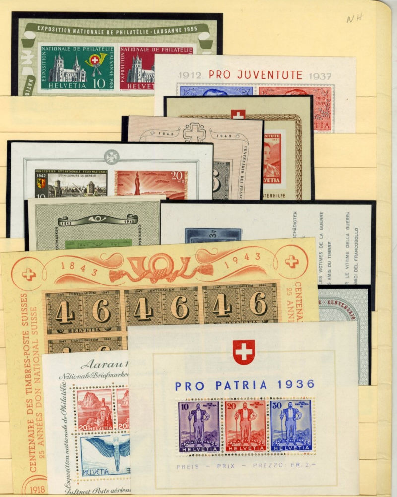 1190 nh   imageLARGE LOTS AND COLLECTIONS SWITZERLAND (226/B206) 1934-51 souvenir sheets, 16 different including NABA, various semi-postals, with 1935 Pro-Patria block of four souvenir sheets (B80a), all n.h., fine-v.f., cat. value $2734 (Image) (Image 2) (Image 3) (All Images)