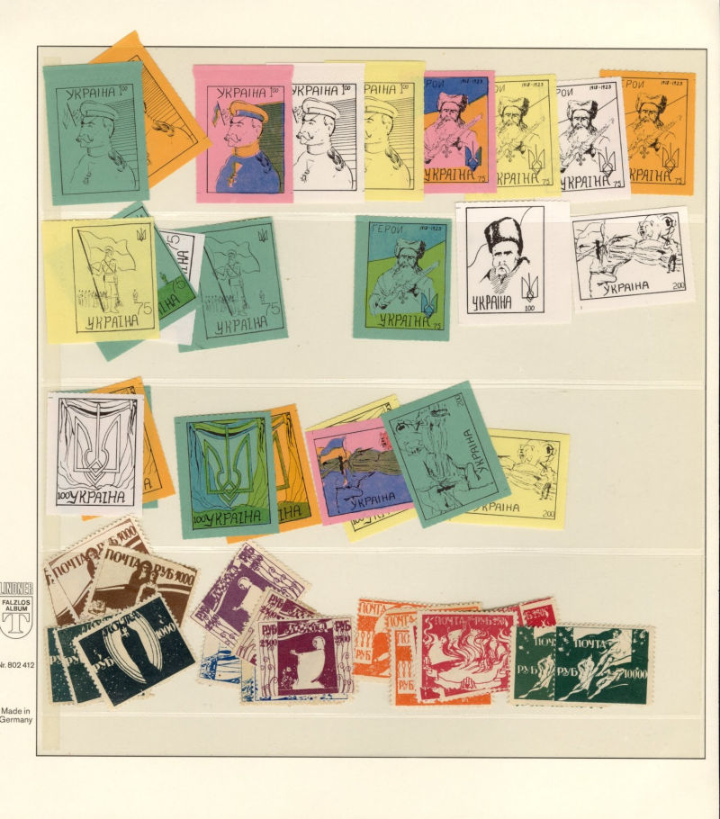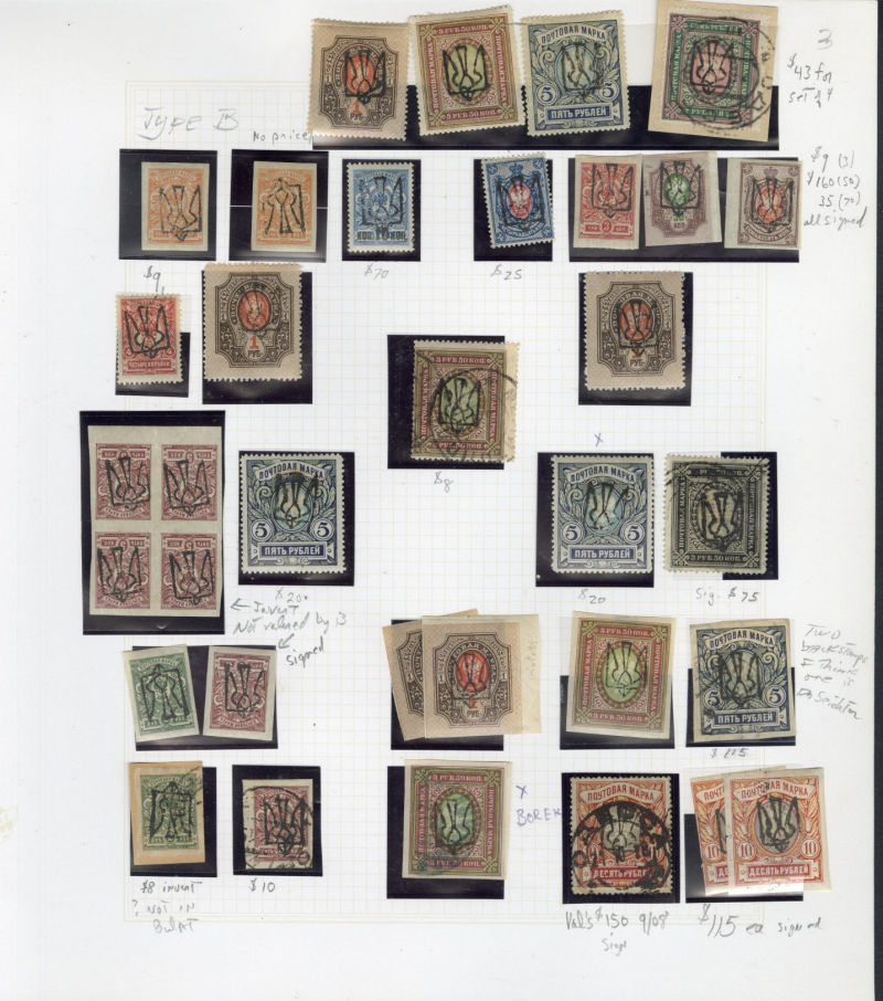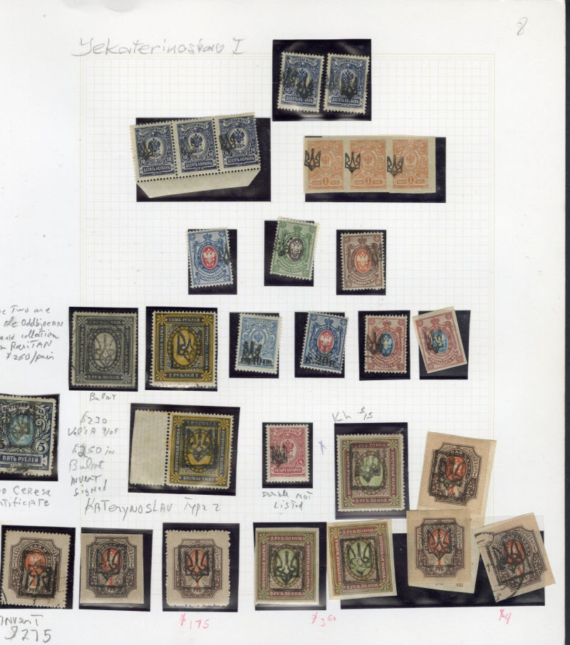 1195 O, og   imageLARGE LOTS AND COLLECTIONS UKRAINE 1918-20 Trident overprints (Kharkov, Odessa, Ekaterinoslav, Podolia), advanced collection of many hundreds used and unused on pages, with variety of districts and types, values to 10r, some vertically laid paper, Local Issues (Homel, Chernihiv, Kherson, Novobelitsa, Bererzovka) and private issues and fantasies, proofs and printer''s waste of the 1920 commemoratives, Revenues, singles, pairs, strips of five, blocks of four and panes of 25, varieties, reference material and forgeries clearly identified, many expert signed, mixed condition, high value collection, ex-Bruce Jarvis (Image) (Image 2) (Image 3) (Image 4) (Image 5) (Image 6) (Image 7) (Image 8) (Image 9) (Image 10) (Image 11) (Image 12) (Image 13) (Image 14) (Image 15) (Image 16) (Image 17) (All Images)