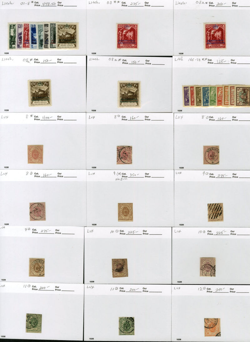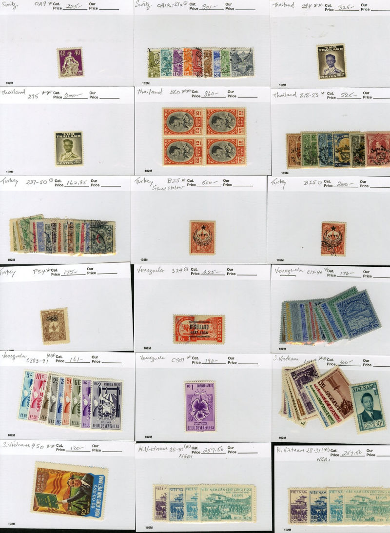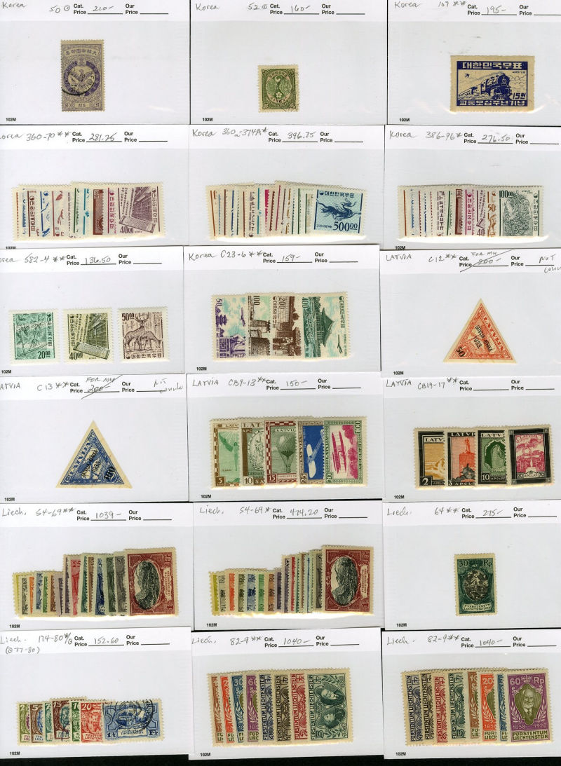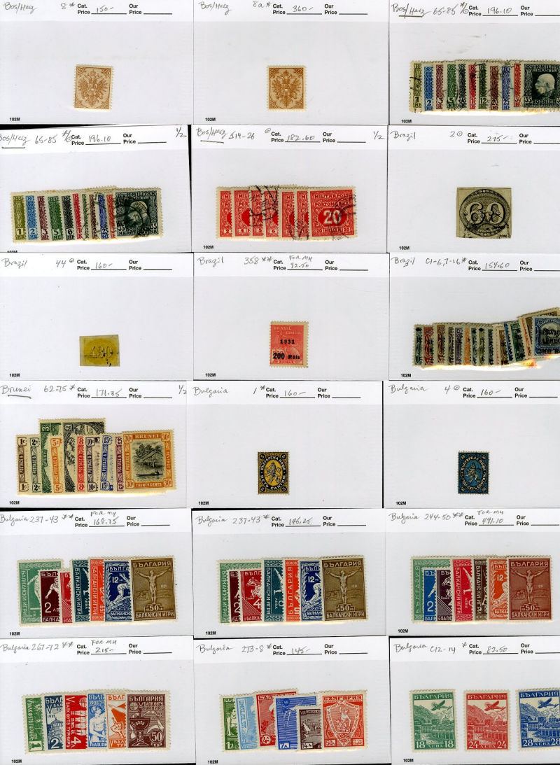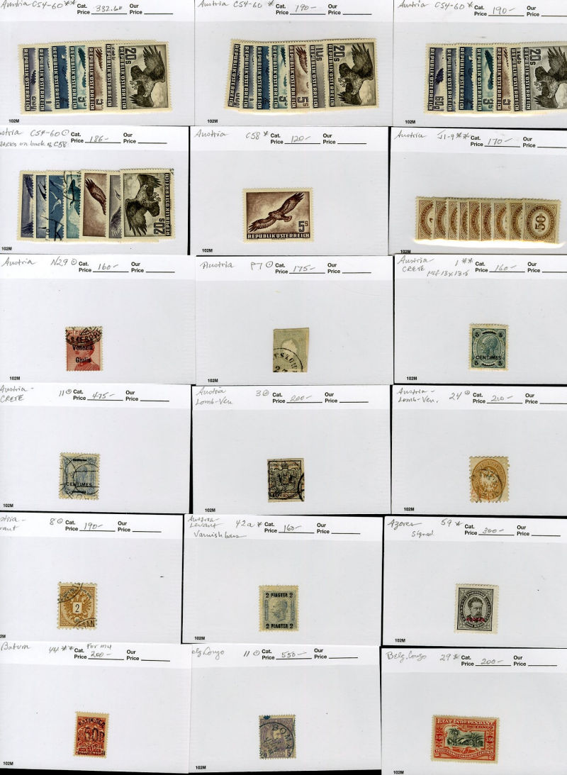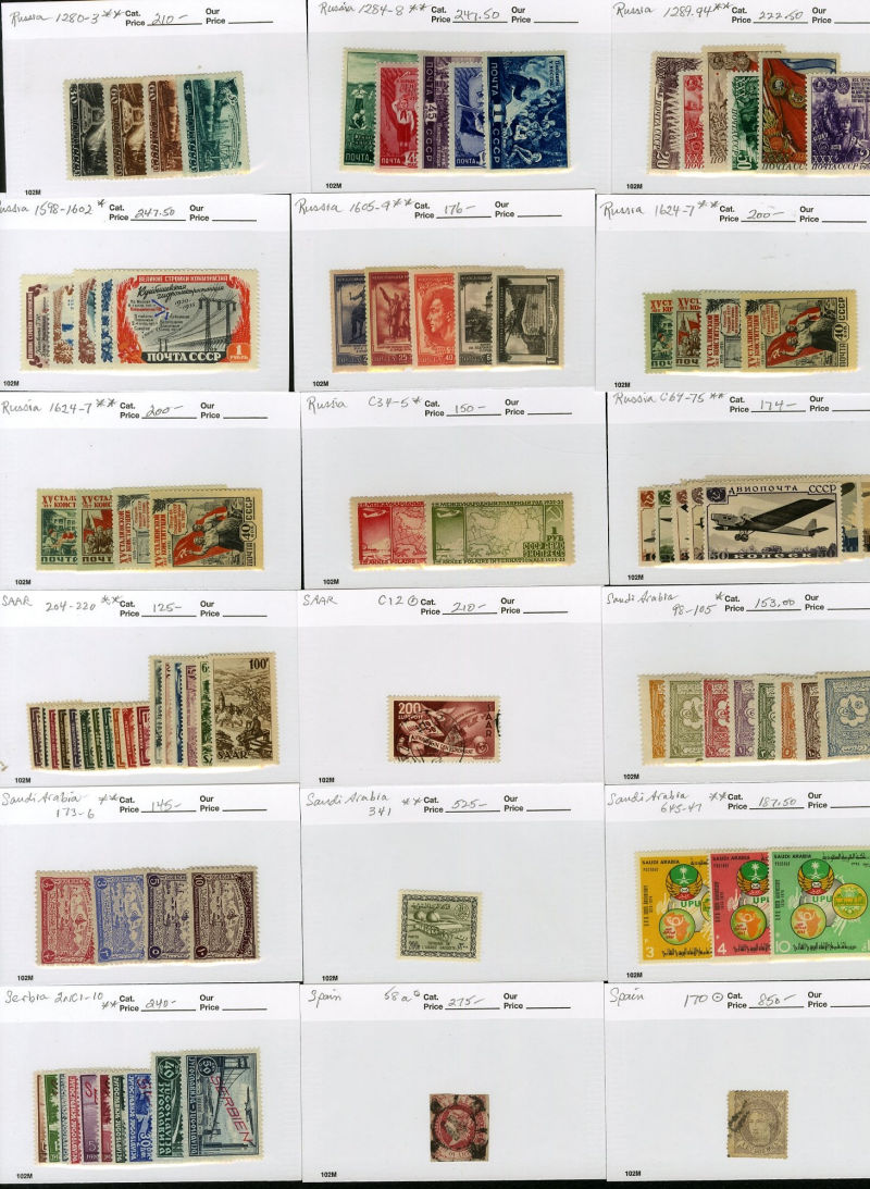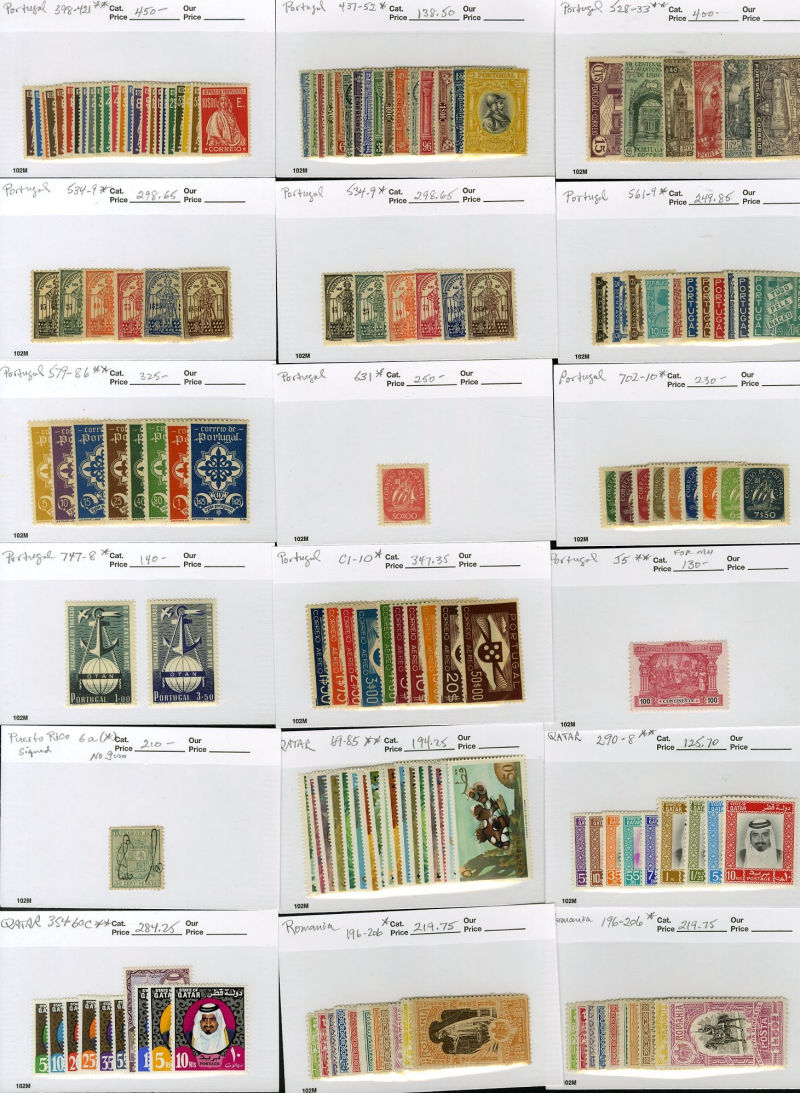 1200 O, nh   imageLARGE LOTS AND COLLECTIONS WORLDWIDE COLLECTIONS and BALANCES 1850-1950s balance of a consignment, good showing of classics, most of the value is in 20th Century singles or sets, neatly displayed on small presentation cards (in Scott catalog order and priced), Austria Semi-Postals, Belgium B69-77 overprints, Orval Abbey and Cardinal Mercier sets, Bolivia Air Post, Bulgaria Balkan Games (237/278), China, with some Large and Small Dragons, ROC 1355-58 (four sets), Scandinavian Countries (better Denmark, Greenland, Iceland, Norway, Sweden), Israel early sets with tabs, Japan, Korea (360/396, etc.), Liechtenstein, Luxembourg, Netherlands (10gld orange), Romania, Russia, Spain and Colonies, Switzerland, Turkey, Yugoslavia, Trieste Zone B, etc. A substantial holding, ideal for resale or internet dealer, mixed condition and some faults noted, few doubtful items not counted, cat. $180,000++ (Image) (Image 2) (Image 3) (Image 4) (Image 5) (Image 6) (Image 7) (Image 8) (Image 9) (Image 10) (Image 11) (Image 12) (Image 13) (Image 14) (Image 15) (Image 16) (Image 17) (Image 18) (Image 19) (Image 20) (Image 21) (Image 22) (Image 23) (Image 24) (Image 25) (Image 26) (Image 27) (Image 28) (Image 29) (Image 30) (Image 31) (Image 32) (Image 33) (Image 34) (Image 35) (Image 36) (Image 37) (All Images)
