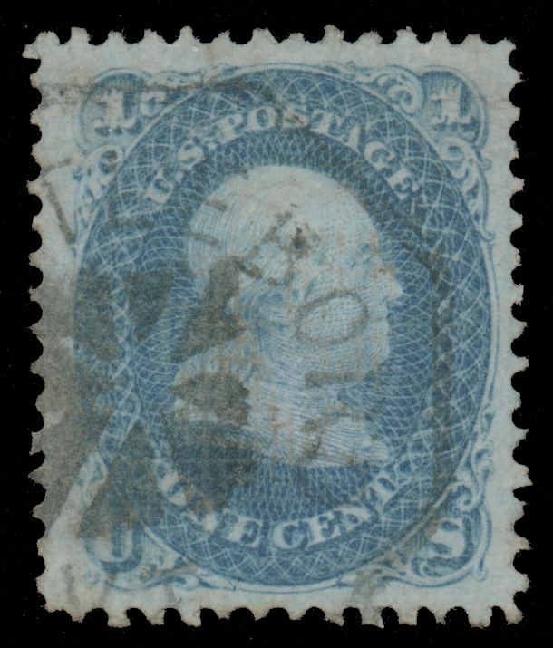 1867, 1c BLUE E GRILL USED GRADED '90J', #86, exceptionally jumbo margined lightly cancelled by Brattleboro, VT d..s and fancy petite square of wedges cancel, bright and fresh, extremely fine jumbo, with 1999 P.F. cert and 2009 PSE cert graded '90J', SMQ $2,650.00