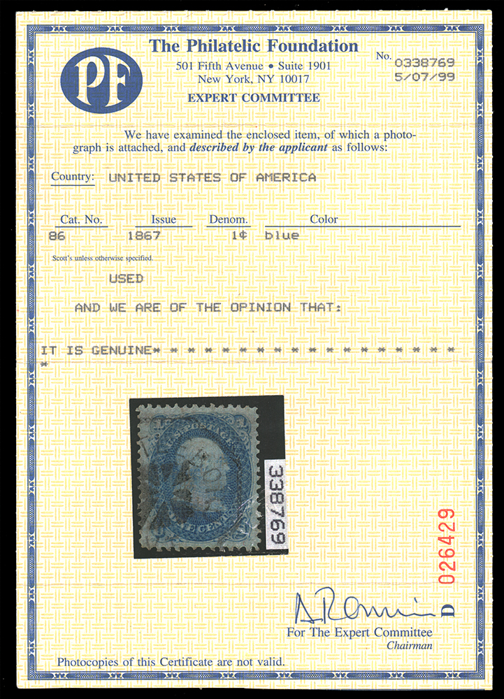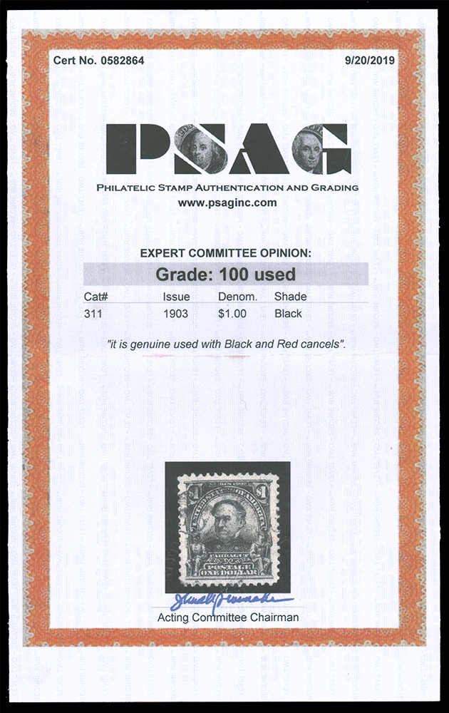 This stamp ranks #6 of 97 examples in the StampAuctionNetwork census. There is only three stamps in the census that achieved the grade of 100. From a grade standpoint it is in the top 2% tier of stamps offered in the past 20+ years. It has the lightest cancellation of any of the stamps in the top 5, The highest price achieved by a gem '100' stamp in the census is $2,832 at an 2013 auction. (Image1) (image2) (All Images)
