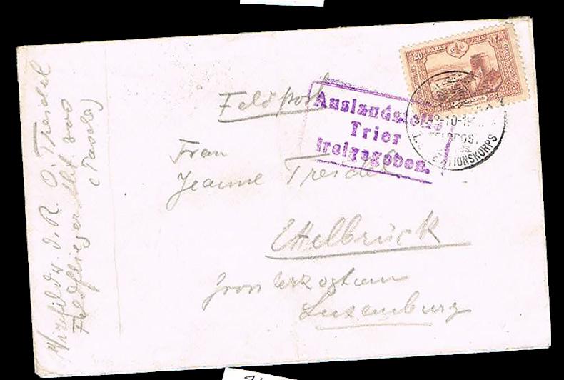 handstamp "checked and approved in Trier" to send to Luxemburg. 20 Para stamp tied by 1st EXPEDITIONSKORPS cancel. Unusual. Photo. Estimated Value $500